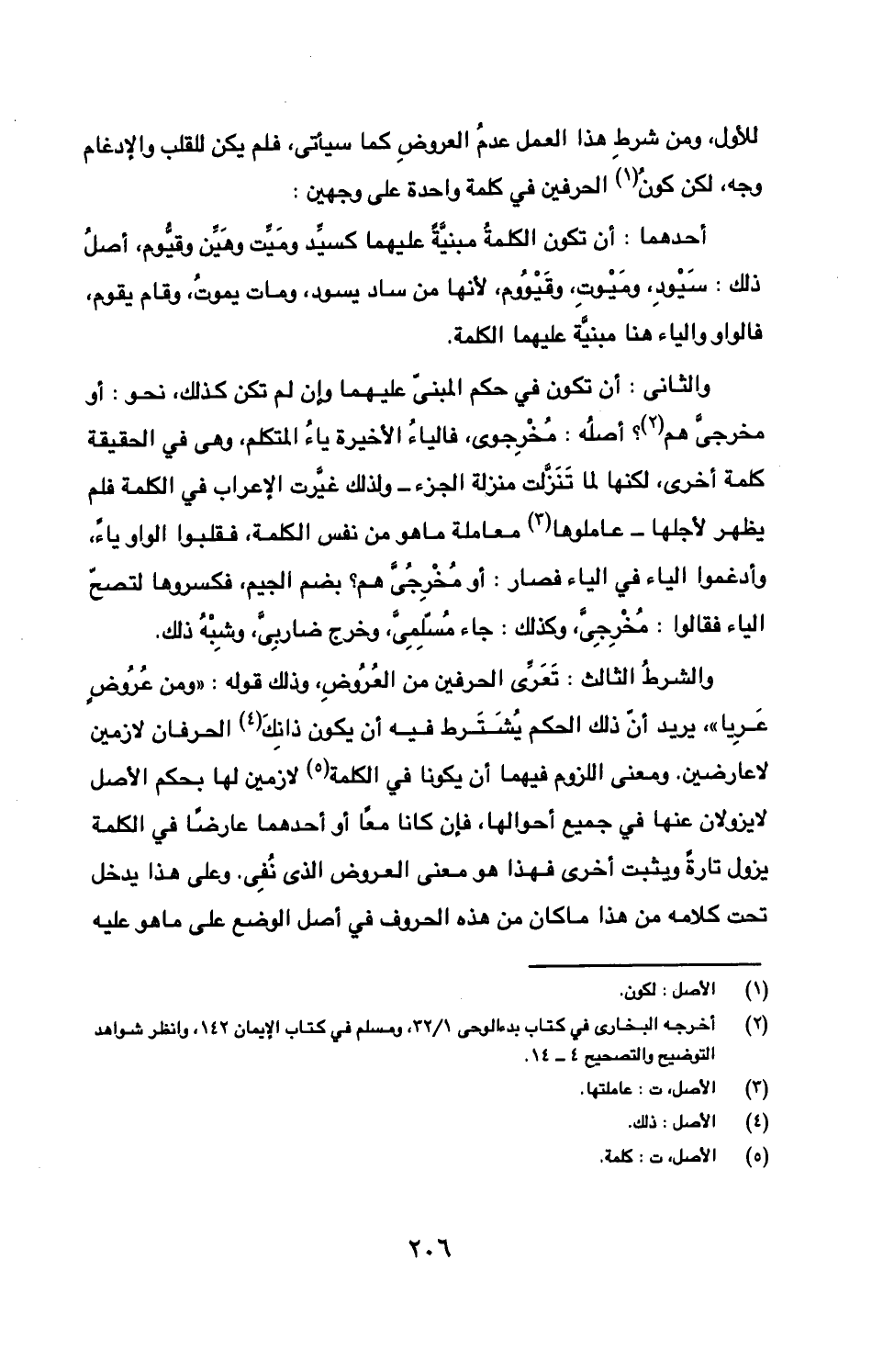 والثاني: أن تكون في حكم المبني عليهما وإن لم تكن كذلك، نحو: أو مخرجي هم؟ أصله: مخرجوي، فالياء الأخيرة ياء المتكلم، وهي في الحقيقة كلمة أخرى، لكنها لما تنزلت منزلة الجزء- ولذلك غيرت الإعراب في الكلمة فلم يظهر لأجلها- عاملوها معاملة ما هو من نفس الكلمة، فقلبوا الواو ياء، وأدغموا الياء في الياء فصار: أو مخرجي هم؟ بضم الجيم، فكسروها لتصح الياء فقالوا: مخرجي، وكذلك: جاء مسلمي، وخرج ضاربي، وشبه ذلك.