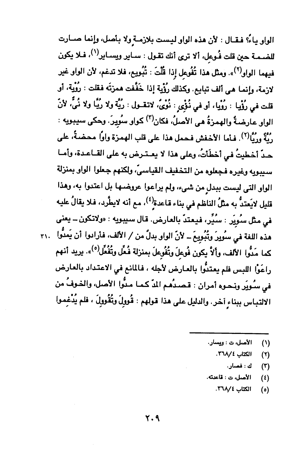 الواو ياء؟ فقال: لأن هذه الواو ليست بلازمة ولا بأصل، وإنما صارت للضمة حين قلت فوعل، ألا ترى أنك تقول: ساير ويساير، فلا يكون فيها الواو". ومثل هذا تفوعل إذا قلت: تبويع، فلا تدغم، لأن الواو غير لازمة، وإنما هي ألف تبايع. وكذلك رؤية إذا خففت همزته فقلت: روية، أو قلت في رؤيا: رويا، أو في نوي، لا تقول: رية ولا ريا ولا ني، لأن الواو عارضة والهمزة هي الأصل، فكان كواو سوير. وحكى سيبويه: رية وريا. فأما الأخفش فحمل هذا على قلب الهمزة واو محضة، على حذ أخطيت في أخطأت، وعلى هذا لا يعترض به على القاعدة، وأما سيبويه وغيره فجعلوه من التخفيف القياسي، ولكنهم جعلوا الواو بمنزلة الواو التي ليست ببدل من شيء، ولم يراعوا عروضها بل اعتدوا به، وهذا قليل لا يعتد به مثل الناظم في بناء قاعدة، مع أنه لا يطرد، فلا يقال عليه في مثل سوير: سير، فيعتد بالعارض. قال سيبويه: "ولا تكون- يعني هذه اللغة في سوير تبويع- لأن الواو بدل من/ الألف، فأرادوا أن يمدوا كما مدوا الألف. وألا يكون فوعل وتفوعل بمنزلة فعل وتفعل". يريد أنهم راعوا اللبس فلم يعتدوا بالعارض لأجله، فالمانع في الاعتداء بالعارض في سوير ونحوه أمران: قصدهم المد كما مدوا الأصل، والخوف من الالتباس ببناء آخر. والدليل على هذا قولهم: قوول وتقوول، فلم يدغموا