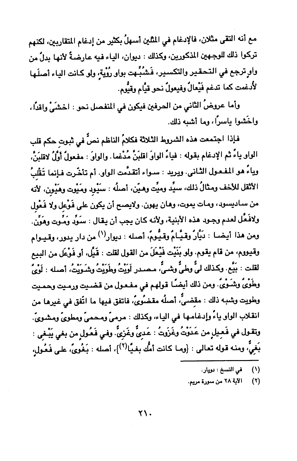 مع أنه التقى مثلان، فالإدغام في المثلين أسهل بكثير من إدغام المتقاربين، لكنهم تركوا ذلك للوجهين المذكورين، وكذلك: ديوان، الياء فيه عارضة لأنها بدل من واو ترجع في التحقير والتكسير، فشبهت بواو روية، ولو كانت الياء أصلها لأدغمت كما تدغم فيعال وفيعول نحو قيام وقيوم.