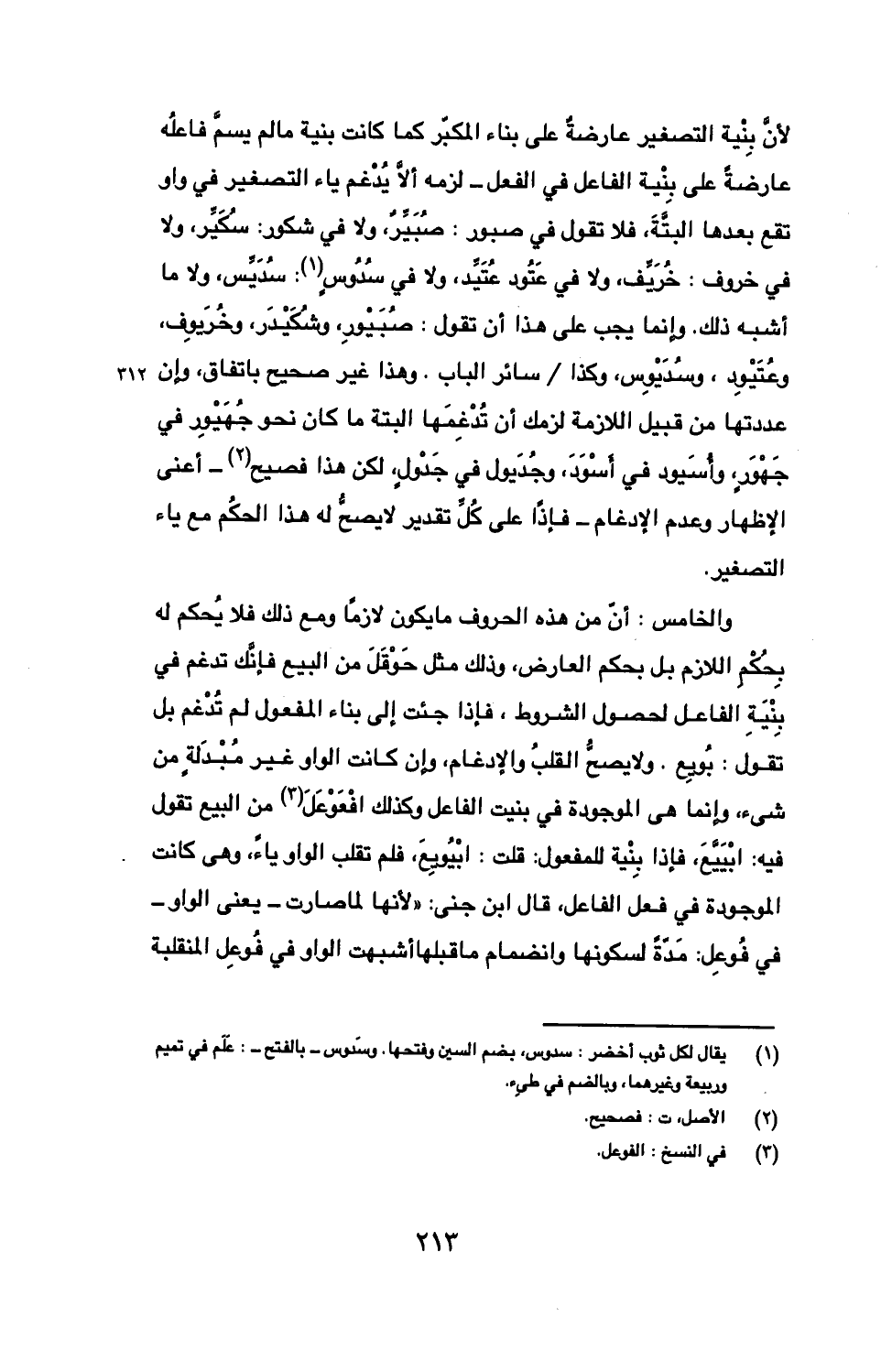 لأن بنية التصغير عارضة على بناء المكبر كما كانت بنية ما لم يسم فاعله عارضة على بنية الفاعل في الفعل- لازمه ألا تدغم ياء التصغير في واو تقع بعدها البتة، فلا تقول في صبور: صبير، ولا في شكور: شُكَيِّر، ولا في خروف، خريف، ولا في عتود عتيد، ولا في سدوس: سديس، ولا ما أشبه ذلك. وإنما يجب على هذا أن تقول: صبيور، وشكيدر، وخريوف، وعتيود، وسديوس، وكذا/ سائر الباب. وهذا غير صحيح باتفاق، وإن عددتها من قبيل اللازمة لزمك أن تدغمها البتة ما كان نحو جمهور في جهور، وأسيود في أسود، وجديول في جدول، لكن هذا فصيح- أعني الإظهار وعدم الإدغام- فإذا على كل تقدير لا يصح له هذا الحكم مع ياء التصغير.
