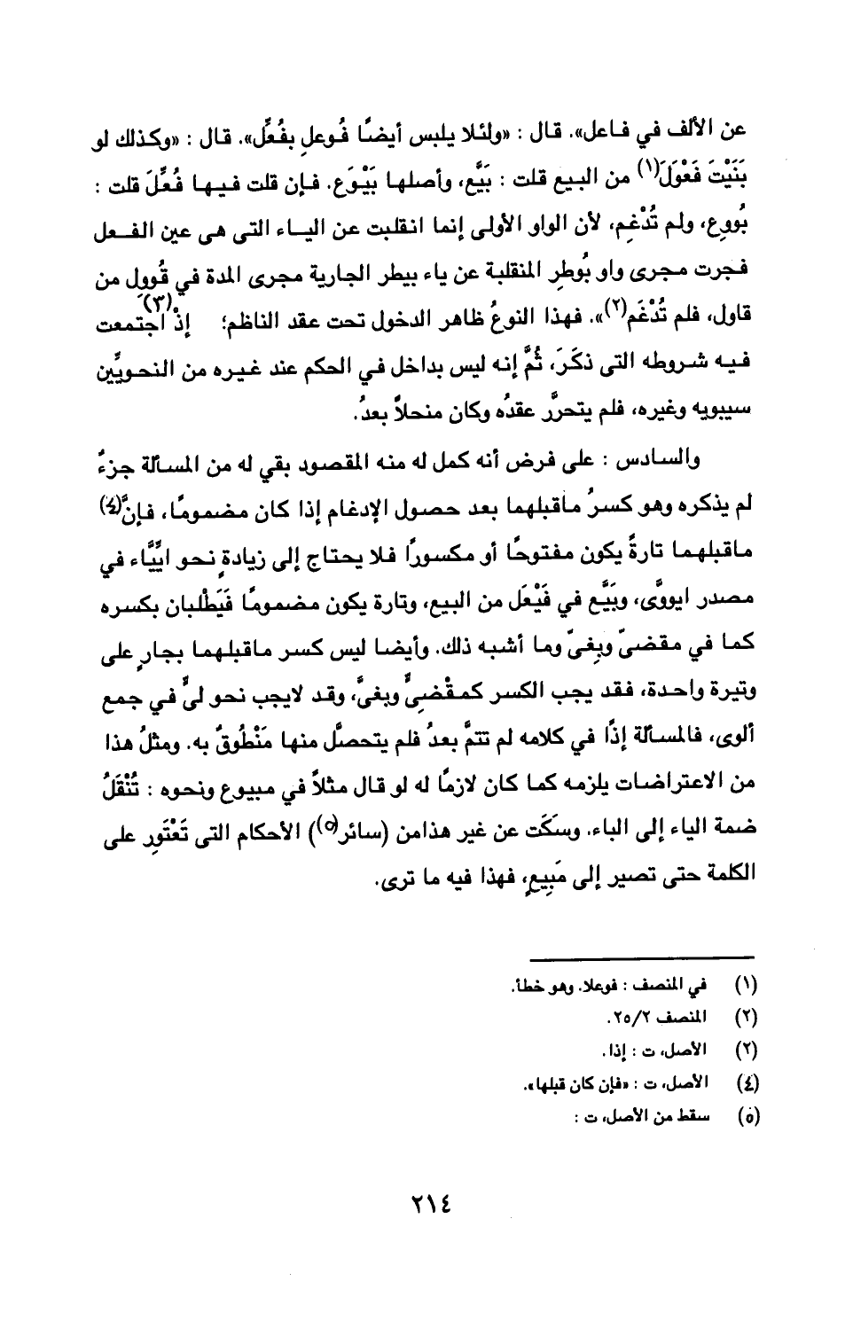 والسادس: على فرض أنه كمل له منه المقصود بقي له من المسألة جزء لم يذكره وهو كسر ما قبلها بعد حصول الإدغام إذا كان مضموما، فإن ما قبلهما تارة يكون مفتوحا أو مكسورا فلا يحتاج إلى زيادة نحو ايياء في مصدر ايووي، وبيع في فيعل من البيع، وتارة يكون مضموما فيطلبان بكسره كما في مقضي وبغي وما أشبه ذلك. وأيضا ليس كسر ما قبلهما بجار على وتيرة واحدة، فقد يجب الكسر كمضي وبغي، وقد لا يجب نحو لي في جمع ألوى، فالمسألة إذا في كلامه لم تتم بعد فلم يتحصل منها منطوق به. ومثل هذا من الاعتراضات يلزمه كما كان لازما له لو قال مثلا في مبيوع ونحوه: تنقل ضمة الياء إلى الباء. وسكت عن غير هذا من (سائر) الأحكام التي تعتور على الكلمة حتى تصير إلى مبيع، فهذا فيه ما ترى.