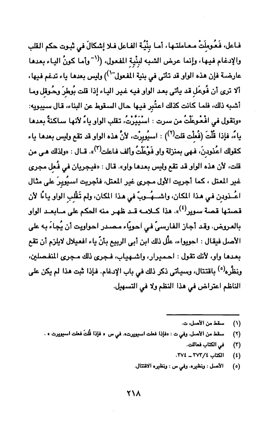 فاعل، فعوملت معاملتها، أما بنية الفاعل فلا إشكال في ثبوت حكم القلب والإدغام فيها، وإنما عرض الشبه لبنية المفعول، (وأما كون الياء بعدها عارضة فإن هذه الواو قد تأتي في بنية المفعول) وليس بعدها ياء تدغم فيها، ألا ترى أن فوعل قد يأتي بعد الواو فيه غير الياء إذا قلت بوطر وحوقل وما أِبه ذلك، فلما كانت كذلك اعتبر فيها حال السقوط عن البناء، قال سيبويه: "وتقول في افعوعلت من سرت: اسييرت، تقلب الواو ياء لأنها ساكنة بعدها ياء، فإذا قلت (فعلت قلت): اسيويرت، لأن هذه الواو قد تقع وليس بعدها ياء كقولك اعذودن، فهي بمنزلة واو فوعلت وألف فاعلت". قال: "ولذلك هي من قلت، لأن هذه الواو تقع وليس بعدها واو". قال: "فيجريان في فعل مجرى غير المعتل، كما أجريت الأول مجرى غير المعتل، فأجريت اسيوير على مثال اعذوذن في هذا المكان، واشهوب في هذا المكان، ولم تقلب الواو ياءاً لأن قصتها قصة سوير". هذا كلامه قد ظهر منه الحكم على ما بعد الواو بالعروض. وقد أجاز الفارسي في احوياء مصدر احواويت أن يجاء به على الأصل فيقال: احويواء، علل ذلك ابن أبي الربيع بأن ياء افعيلال لا يلزم أن تقع بعدها واو، لأنك تقول: احميرار، واشهياب، فجرى ذلك مجرى المنفصلين، ونظره باقتتال، وسيأتي ذكر ذلك الإدغام. فإذا ثبت هذا لم يكن على الناظم اعتراض في هذا النظم ولا في التسهيل.