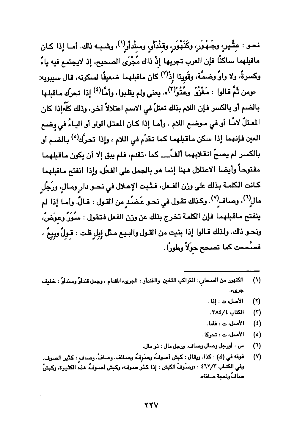 نحو: عثير، وجهور، وكنهور، وقندأو، وسندأو، وشبه ذلك. أما إذا كان ما قبلها ساكنا فإن العرب تجريها إذ ذاك مجرى الصحيح، إذ لا يجتمع فيه ياء وكسرة، ولا واو وضمة، وقويتا إذ كان ما قبلهما ضعيفا لسكونه، قال سيبويه: "ومن ثم قالوا: مغزو وعتو". يعني ولم يقبلوا، وأما إذا تحرك ما قبلها بالضم أو بالكسر فإن اللام بذلك تعتل في الاسم اعتلالا آخر، وذلك كله إذا كان المعتل لاما أو في موضع اللام. وأما إذا كان المعتل الواو أو الياء في وضع العين فإنهما إذ سكن ما قبلهما كما تقدم في اللام، وإذا تحرك بالضم أو بالكسر لم يصح انقلابها ألف- كما تقدم، فلم يبق إلا أن يكون ما قبلهما مفتوحا وأيضا الاعتلال ههنا إنما هو بالحمل على الفعل، وإذا انفتح ما قبلهما كانت الكلمة بذلك على وزن الفعل، فثبت الإعلال في نحو دار ومال، ورجل مال، وضاف. وكذلك تقول في نحو عضد من القول: قال. وأما إذا لم ينفتح ما قبلهما فإن الكلمة تخرج بذلك عن وزن الفعل فتقول: سور وعوض، ونحو ذلك. ولذلك قالوا إذا بنيت من القول والبيع مثل إبل قلت: قول وبيع، فصححت كما تصحح حولا وطورًا.