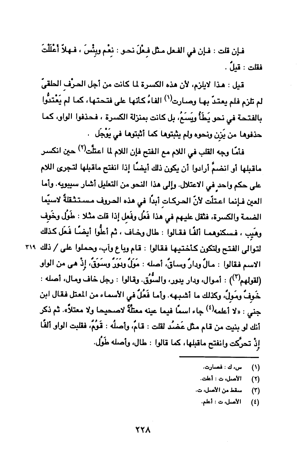 فأما وجه القلب في اللام مع الفتح فإن اللام لما اعتلت حين انكسر ما قبلها أو انضم أرادوا أيكون ذلك أيضا إذا انفتح ما قبلها لتجري اللام على حكم واحد في الاعتلال. وإلى هذا النحو من التعليل أشار سيبويه. وأما العين فإنما اعتلت لأن الحركات أبدا في هذه الحروف مستثقلة لاسيما الضمة والكسرة، فثقل عليهم في هذا فعل وفعل إذا قلت مثلا: طول وخوف وهيب، فسكونهما ألفا فقالوا: طال وخاف، ثم أعلوا أيضا فعل كذلك لتوالى الفتح ولتكون كأختيها فقالوا: قام وباع وآب، وحملوا على / ذلك الاسم فقالوا: مال ودار وساق، أصله: مول ودور وسوق، إذ هي من الواو (لقولهم): أموال، ودار يدور، والسوق. وقالوا: رجل خاف ومال، أصله: خوف ومول، وكذلك ما أشبهه. وأما فعل في الأسماء من المعتل فقال ابن جني: "لا أعلمه جاء اسما فيما عينه معتلة لا صحيحا ولا معتلا". ثم ذكر أنك لو بنيت من قام مثل عضد لقلت: قام، وأصله: قوم، فقلبت الواو ألفا إذ تحركت وانفتح ما قبلها، كما قالوا: طال، وأصله طول.