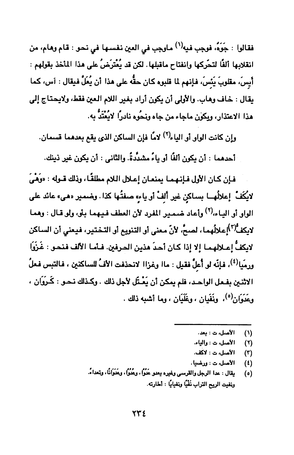 فقالوا: جوه، فوجب فيه ما وجب في العين نفسها في نحو: قام وهام، من انقلابها ألفا لتحركها وانفتاح ما قبلها. لكن قد يعترض على هذا المأخذ بقولهم: أيس، مقلوب يئس، فإنهم لما قلبوه كان حقه على هذا أن يعل فيقال: آس، كما يقال: خاف وهاب. والأولى أن يكون أراد بغير اللام العين فقط، ولا يحتاج إلى هذا الاعتذار، ويكون ما جاء من جاه ونحوه نادرا لا يعتد به.