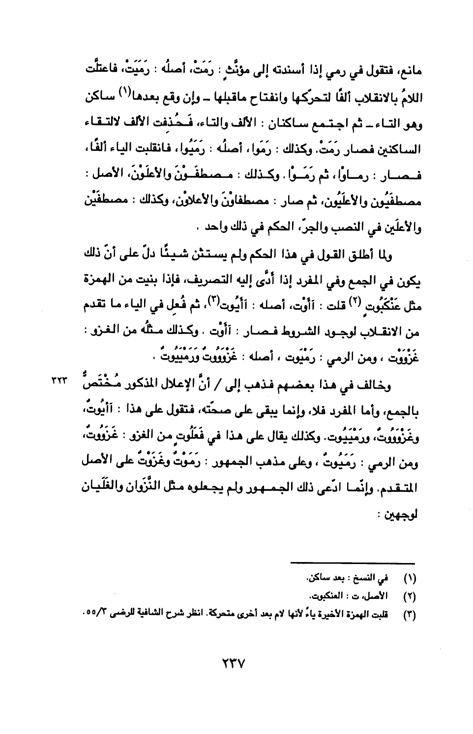 مانع، فتقول في رمي إذا أسندته إلى مؤنث: رمت، أصله: رميت، فاعتلت اللام بالانقلاب ألفا لتحركها وانفتاح ما قبلها- وإن وقع بعدها ساكن وهو التاء- ثم اجتمع ساكنان: الألف والتاء، فحذفت الألف لالتقاء الساكنين فصار رمت. وكذلك: رموا، أصله: رميوا، فانقلبت الياء ألفا، فصار: رماوا، ثم رموا. وكذلك: مصطفون والأعلون، الأصل: مصطفيون والأعليون، ثم صار: مصطفاون والأعلاون، وكذلك: مصطفين والأعلين في النصب والجر، الحكم في ذلك واحد.