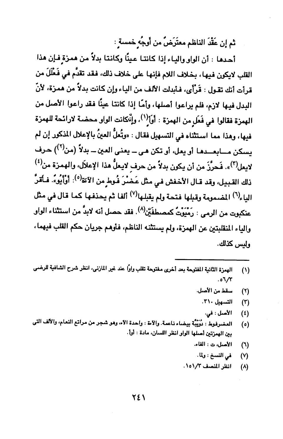 أحدها: أن الواو والياء إن كانتا عينا وكانتا بدلا من هزة فإن هذا القلب لا يكون فيها، بخلاف اللام فإنها على خلاف ذلك، فقد تقدم في فعل من قرأت أنك تقول: قرأي، فأبدلت الألف من الياء وإن كانت بدلا من همزة، لأن البدل فيها لازم، فلم يراعوا أصلها، وأما إذا كانت الواو محضة لا رائحة للهمزة فيها، وهذا مما استثناه في التسهيل فقال: "وتعل العين بالإعلال المذكور إن لم يسكن ما بعدها أو يعل، أو تكن هي- يعني العين- بدلا (من) حرف لا يعل". فحرز من أن يكون بدلا من حرف لا يعل هذا الإعلال، والهمزة من ذلك القبيل، وقد قال الأخفش في مثل عضر فوط من الآءة: أوأيوء. فأقر الياء المضمومة وقبلها فتحة ولم يقبلها ألفا ثم يحذفها كما قال في مثل عنكبوت من الرمي: رميوت كمصطفين. فقد حصل أنه لا بد من استثناء الواو والياء المنقلبتين عن الهمزة، ولم يستثنه الناظم، فأوهم جريان حكم القلب فيهما، وليس كذلك.