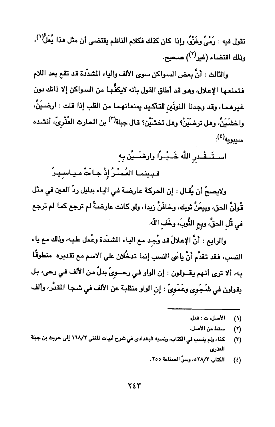 والثالث: أن بعض السواكن سوى الألف والياء المشددة قد تقع بعد اللام فتمنعها الإعلال، وهو قد أطلق القول بأنه لا يكفها من السواكن إلا ذانك دون غيرهما، وقد وجدنا النونين للتأكيد يمنعانهما من القلب إذا قلت: ارضين، واخشين، وهل ترضين؟ وهل تخشين؟ قال جبلة بن الحارث العذري، أنشده سيبويه: