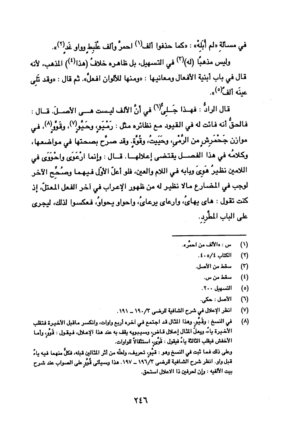 قال الراد: فهذا جلي في أن الألف ليست هي الأصل. قال: فالحق أنه فائت له في القيود مع نظائره مثل: رميو، وحيو، وقوو، في موازن جحمرش من الرمي، وحييت، وقوة. وقد صرح بصحتها في مواضعها، وكلامه في هذا الفصل يقتضي إعلالها. قال: وإنما ارعوي واحووي في اللامين نظير هوى وبابه في اللام والعين، فلو أعل الأول فيهما وصحح الآخر لوجب في المضارع مالا نظير له من ظهور الإعراب في آخر الفعل المعتل، إذ كنت تقول: هاي يهاي، وارعاي يرعاي، واحواو يحواو، فعكسوا لذلك، ليجري على الباب المطرد.