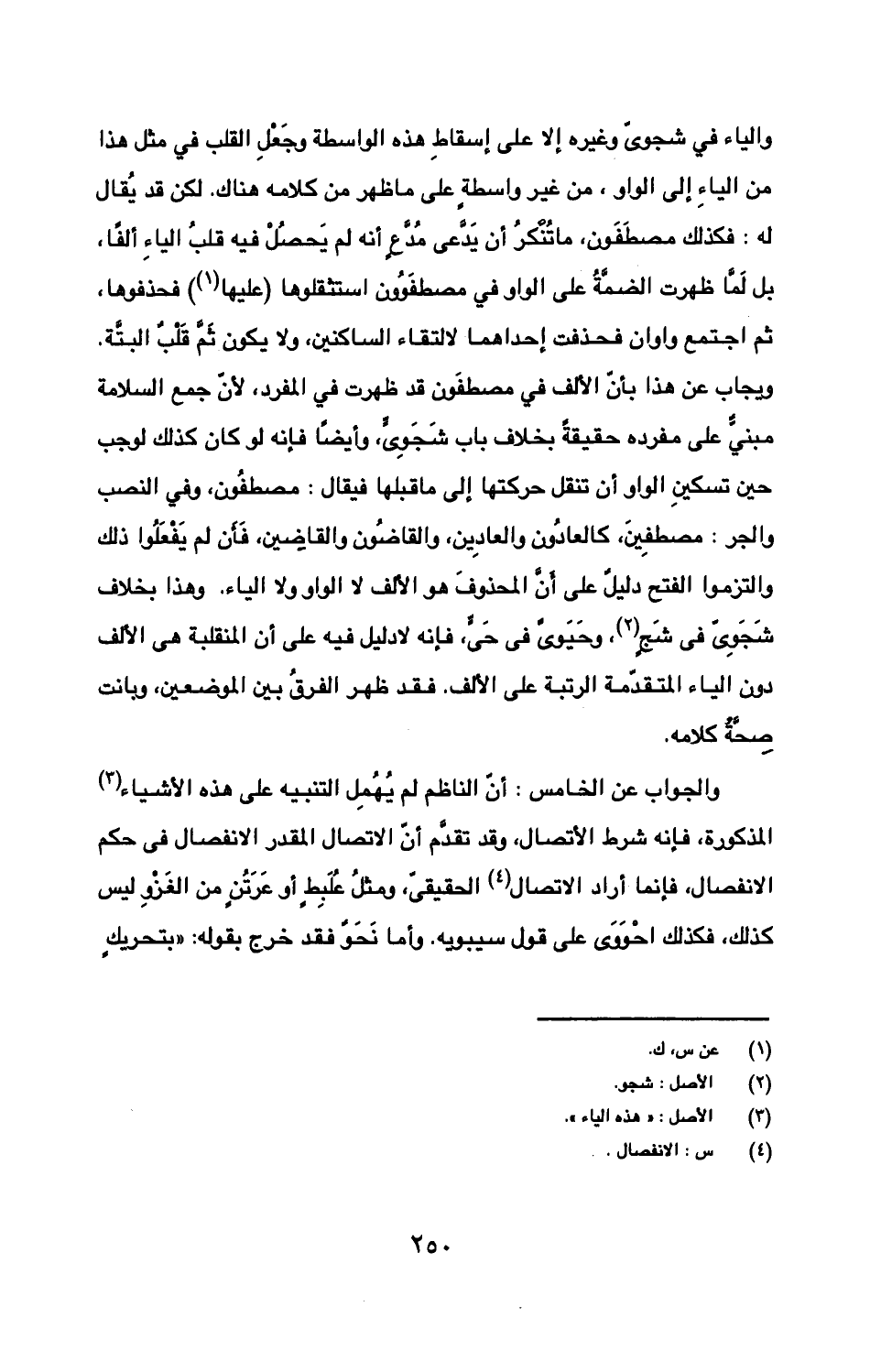 والياء في شجوي وغيره إلا على إسقاط هذه الواسطة وجعل القلب في مثل هذا من الياء إلى الواو، من غير واسطة على ما ظهر من كلامه هناك. لكن قد يقال له: فكذلك مصطفون، ما تنكر أن يدعي مدع أنه لم يحصل فيه قلب الياء ألفا، بل لما ظهرت الضمة على الواو في مصطفوون استثقلوها (عليها) فحذفوها، ثم اجتمع واوان فحذفت إحداهما لالتقاء الساكنين، ولا يكون ثم قلب البتة. ويجاب عن هذه بأن الألف في مصطفون قد ظهرت في المفرد، لأن جمع السلامة مبني على مفرده حقيقة بخلاف باب شجوي، وأيضا فإنه لو كان كذلك لوجب حين تسكين الواو أن تنقل حركتها إلى ما قبلها فيقال: مصطفون، وفي النصب والجر: مصطفين، كالعادون والعادين، والقاضون والقاضين، فأن لم يفعلوا ذلك والتزموا الفتح دليل على أن المحذوف هو الألف لا الواو ولا الياء. وهذا بخلاف شجوي في شج، وحيوي في حي، فإنه لا دليل فيه على أن المنقلبة هي الألف دون الياء المتقدمة الرتبة على الألف. فقد ظهر الفر بين الموضعين، وبانت صحة كلامه.