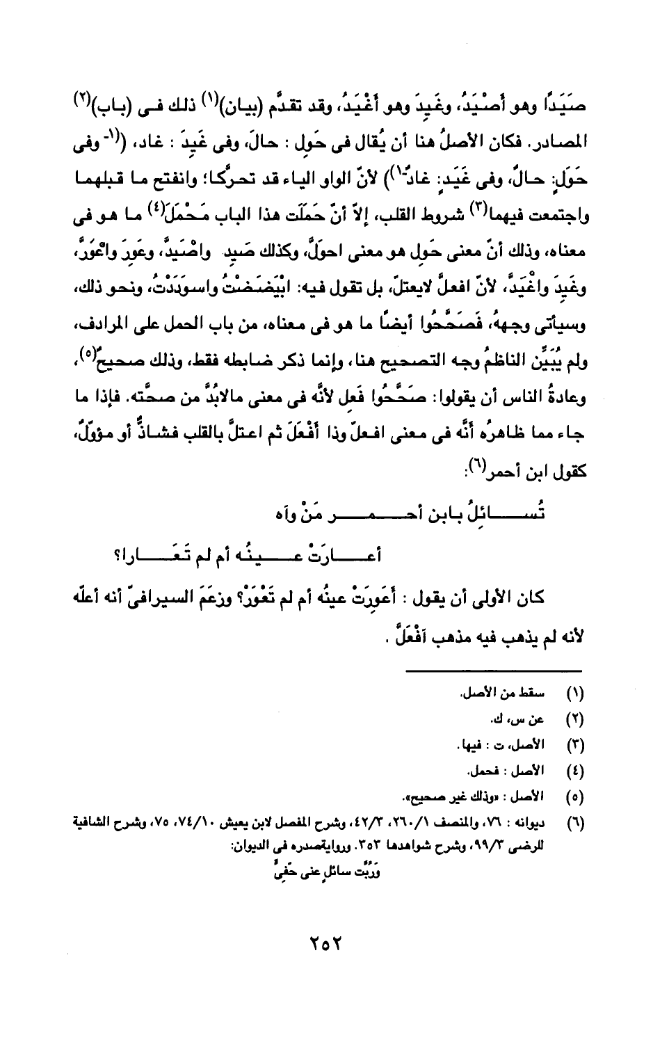 صيدا وهو أصيد، وغيد وهو أغيد، وقد تقدم (بيان) ذلك في (باب) المصادر. فكان الأصل هنا أن يقال في حول: حال، وفي غيد: غاد، (وفي حول: حال، وفي غيد: غاد) لأن الواو الياء قد تحركا؛ وانفتح ما قبلهما واجتمعت فيهما شروط القلب، إلا أن حملت هذا الباب محمل ما هو في معناه، وذلك أن معنى حول هو معنى أحول، كذلك صيد واصيد، وعور واعور، وغيد واغيد، لأن فعل لا يعتل، بل تقول فيه: ابيضضت واسوددت، ونحو ذلك، وسيأتي وجهه، فصححوا أيضا ما هو في معناه، من باب الحمل على المرادف، ولم يبين الناظم وجه التصحيح هنا، وإنما ذكر ضابطه فقط، وذلك صحيح، وعادة الناس أن يقولوا: صححوا فعل لأنه في معنى لا بد من صحته. فإذا ما جاء مما ظاهره أنه في معنى افعل وذا أفعل ثم اعتل بالقلب فشاذ أو مؤول، كقول ابن أحمر: