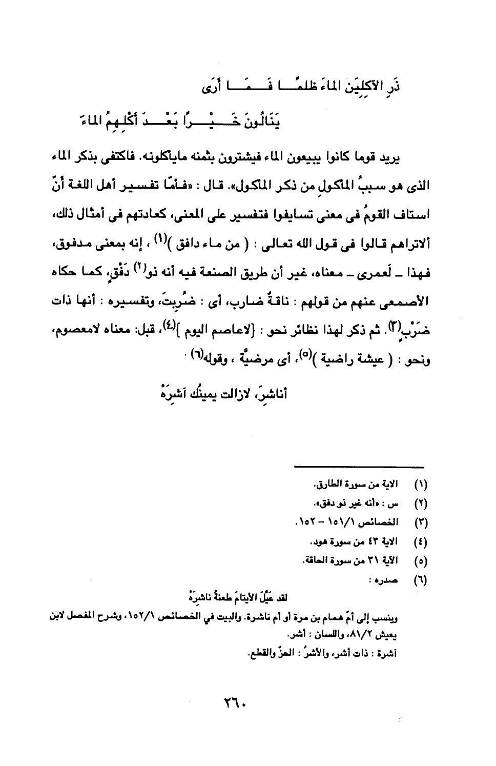 يريد قوما كانوا يبيعون الماء فيشترون بثمنه ما يأكلونه. فاكتفى بذكر الماء الذي هو سبب المأكول من ذكر المأكول". قال: "فأما تفسير أهل اللغة أن استاف القوم في معنى تسايفوا فتفسير على المعنى، كعادتهم في أمثال ذلك، ألا تراهم قالوا في قول الله تعالى: {من ماء دافق}، إنه بمعنى مدفوق، فهذا- لعمري- معناه، غير أن طريق الصنعة فيه أنه ذو دفق، كما حكاه الأصمعي عنهم من قولهم: ناقة ضارب، أي: ضربت، وتفسيره: أنها ذات ضرب. ثم ذكر لهذا نظائر نحو: {لا عاصم اليوم}، قبل معناه لا معصوم، ونحو (عيشة راضية)، أي مرضية، وقوله: