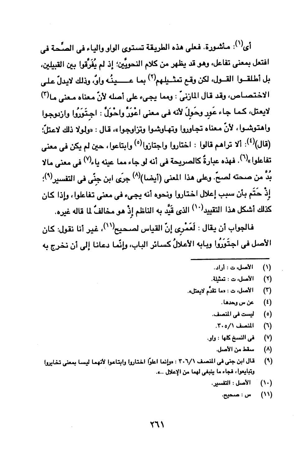 أي: مأشورة. فعلى هذه الطريقة تستوي الواو والياء في الصحة في افتعل بمعنى تفاعل، وهو قد يظهر من كلام النحويين؛ إذ لم يفرقوا بين القبيلين، بل أطلقوا القول، لكن وقع تمثيلهم بما عينه واو، وذلك لا يدل على الاختصاص، وقد قال المازني: ومما يجئ على أصله لأن معناه ما لا يعتل، كما جاء عور وحول لأنه في معنى اعور واحول: اجتوروا وازدوجوا واهتوشوا، لأن معناه تجاوروا وتهاوشوا وتزاوجوا"، قال: "ولولا ذلك لا عتل؛ (قال): ألا تراهم قالوا: اختاروا واجتازوا وابتاعوا، حين لم يكن في معنى تفاعلوا". فهذه عبارة كالصريحة في أنه لو جاء مما عينه ياء في معنى ما لا بد من صحته لصح. وعلى هذا المعنى (أيضا) جرى ابن جني في التفسير؛ إذ حتم بأن سبب إعلال اختاروا ونحوه أنه يجئ في معنى تفاعلوا، وإذا كان كذلك أشكل هذا التقييد الذي قي به الناظم إذ هو مخالف لما قاله غيره.