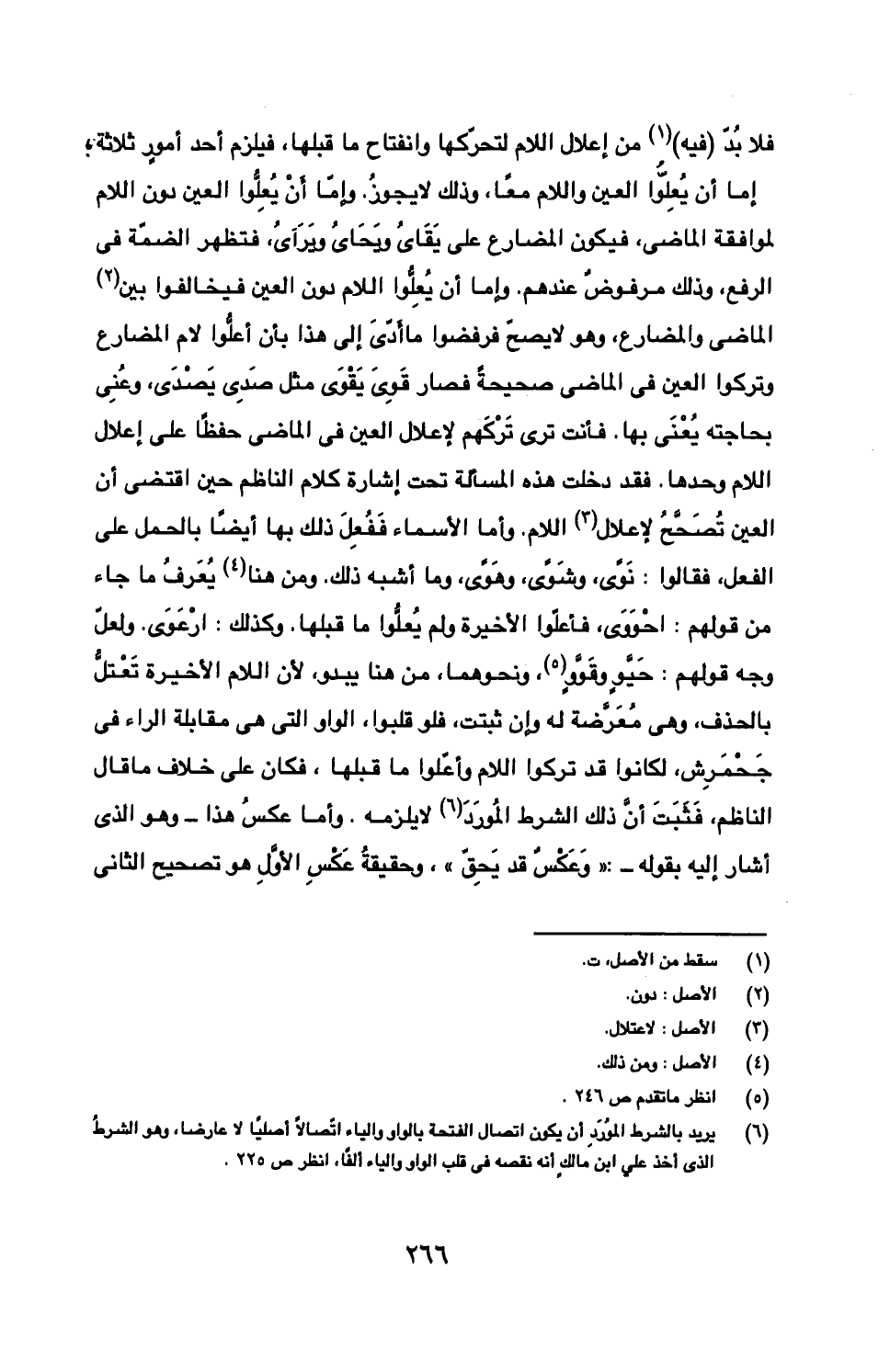 فلا بد (فيه) من إعلال اللام لتحركها وانفتاح ما قبلها، فيلزم أحد أمور ثلاثة؛ إما أن يعلوا العين واللام معا، وذلك لا يجوز. وإما أن يعلوا العين دون اللام لموافقة الماضي، فيكون المضارع على يقاي ويحاي ويرآي، فتظهر الضمة في الرفع، وذلك مرفوض عندهم. وإما أن يعلوا اللام دون العين فيخالفوا بين الماضي والمضارع، وهو لا يصح فرفضوا ما أدى إلى هذا بأن أعلوا لام المضارع وتركوا العين في الماضي صحيحة فصار قوي يقوي مثل صدي يصدى، وعني بحاجته يعنى بها. فأنت ترى تركها لإعلال العين في الماضي حفظا على إعلال اللام وحدها، فقد دخلت هذه المسألة تحت إشارة كلام الناظم حين اقتضى أن العين تصحح لإعلال اللام. وأما الأسماء ففعل ذلك بها أيضا بالحمل على الفعل، فقالوا: نوي، وشوي، وهوي، وما أشبه ذلك. ومن هنا يعرف ما جاء من قولهم: احوووى، فأعلوا الأخيرة ولم يعلوا ما قبلها. وكذلك: ارعوى. ولعل وجه قولهم: حيو وقوو، ونحوهما، من هنا يبدو، لأن اللام الأخيرة تعتل بالحذف، وهي معرضة له وإن ثبتت، فلو قبلوا، الواو التي هي مقابلة الراء في جحمرش، لكانوا قد تركوا اللام وأعلوا ما قبلها، فكان على خلاف ما قال الناظم، فثبت أن ذلك الشرط المورد لا يلزمه. وأما عكس هذا- وهو الذي أشار إليه بقوله-: "وعكس قد يحق"، وحقيقة عكس الأول هو تصحيح الثاني