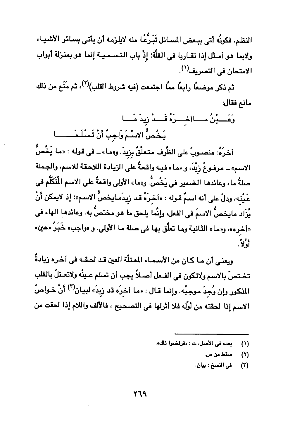 ويعني أن ما كان من الأسماء الم عتلة العين قد لحقه في آخره زيادة تختص بالاسم ولا تكون في الفعل أصلا يجب أن تسلم عينه ولا تعتل بالقلب المذكور وإن وجد موجبه. وإنما قال: "ما آخره قد زيد" لبيان أن خواص الاسم إذا لحقته من أوله فلا أثر لها في التصحيح، فالألف واللام إذا لحقت من