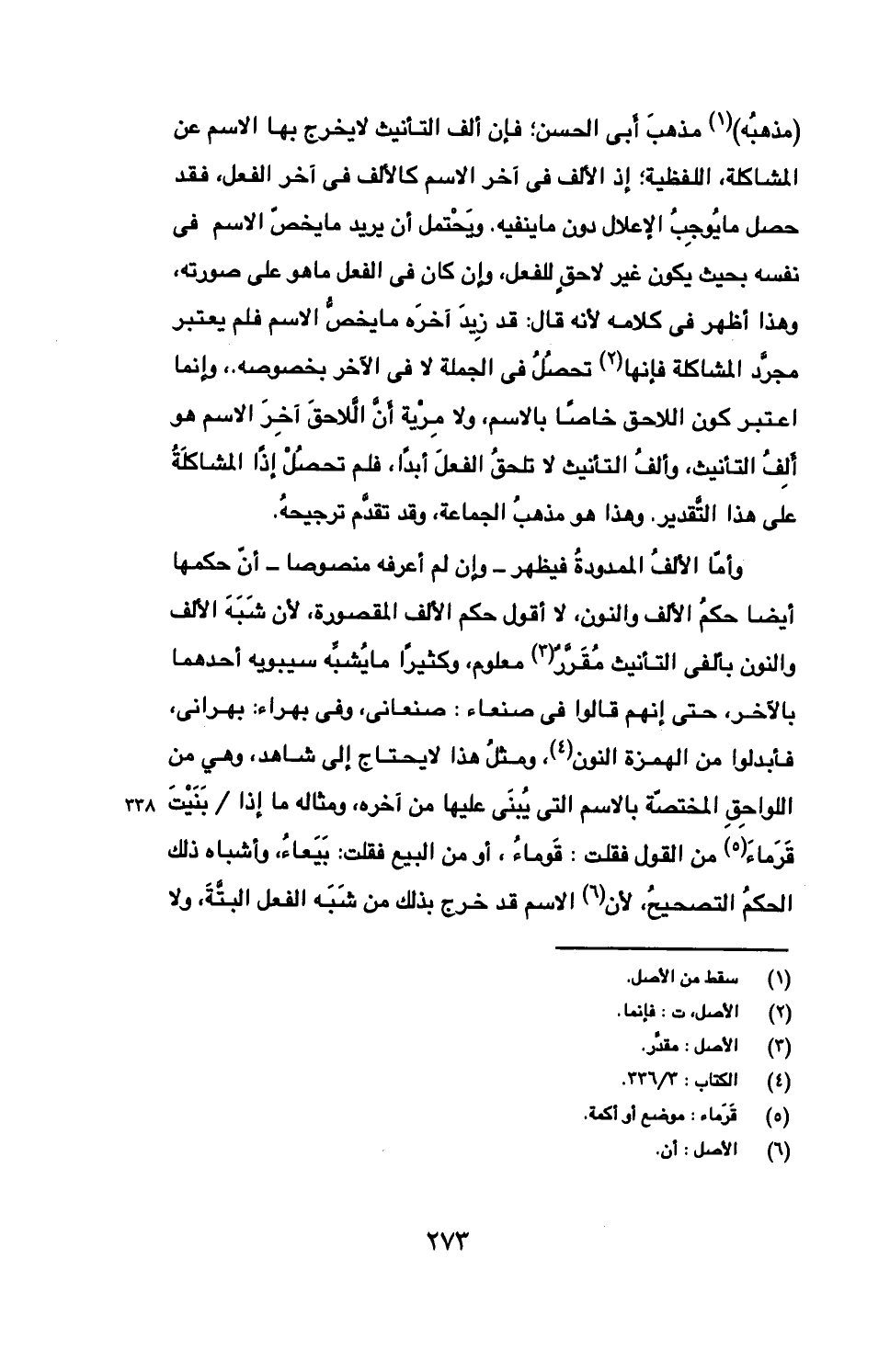 (مذهبه) مذهب أبي الحسن؛ فإن ألف التأنيث لا يخرج بها الاسم عن المشاكلة، اللفظية؛ إذ الألف في آخر الاسم كالألف في آخر الفعل، فقد حصل ما يوجب الإعلال دون ما ينفيه. ويحتمل أن يري ما يخص الاسم في نفسه بحيث يكون غير لاحق للفعل، وإن كان في الفعل ما هو على صورته، وهذا أظهر في كلامه لأنه قال: قد زيد آخره ما يخص الاسم فلم يعتبر مجرد المشاكلة فإنها تحصل في الجملة لا في الآخر بخصوصه.، وإنما اعتبر كون اللاحق خاصا بالاسم، ولا مرية أن اللاحق آخر الاسم هو ألف التأنيث، وألف التأنيث لا تلحق الفعل أبدا، فلم تحصل إذا المشاكلة على هذا التقدير. وهذا هو مذهب الجماعة، وقد تقدم ترجيحه.