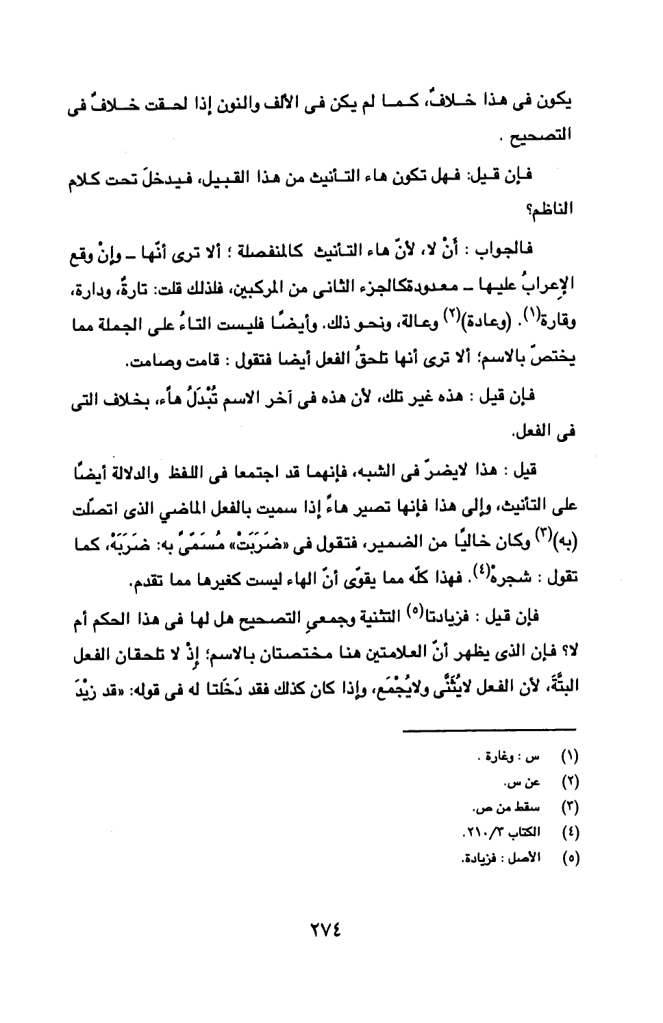 قيل: هذا لا يضر في الشبه، فإنهما قد اجتمعا في اللفظ والدلالة أيضا على التأنيث، وإلى هذا فإنها تصير هاء إذا سميت بالفعل الماضي الذي اتصلت (به) وكان خاليا من الضمير، فتقول في "ضربت" مسمى به: ضربه، كما تقول: شجره". فهذا كله مما يقوى أن الهاء ليست كغيرها مما تقدم.