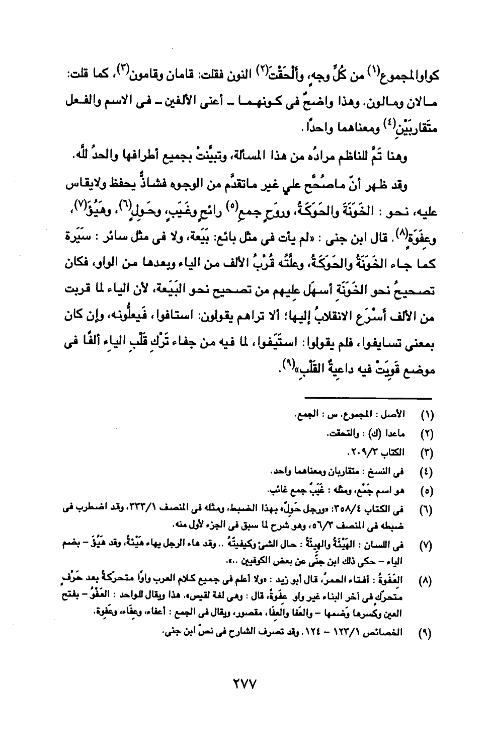 وقد ظهر أن ما صحح على غير ما تقدم من الوجوه فشاذ يحفظ ولا يقاس عليه، نحو: الخونة والحوكة، وروح جمع رائح وغيب، وحول، وهيؤ، وعفوة. قال ابن جني: "لم يأت في مثل بائع: بيعة، ولا في مثل سائر: سيرة كما جاء الخونة والحوكة، وعلته قرب الألف من الياء وبعدها من الواو، فكان تصحيح نحو الخونة أسهل عليهم من تصحيح نحو البيعة، لأن الياء لما قربت من الألف أسرع الانقلاب إليها؛ ألا تراهم يقولون: استافوا، فيعلونه، وإن كان بمعنى تسايفوا، فلم يقولوا: استيفوا، لما فيه من جفاء ترك قلب الياء ألفا في موضع قويت فيه داعية القلب".