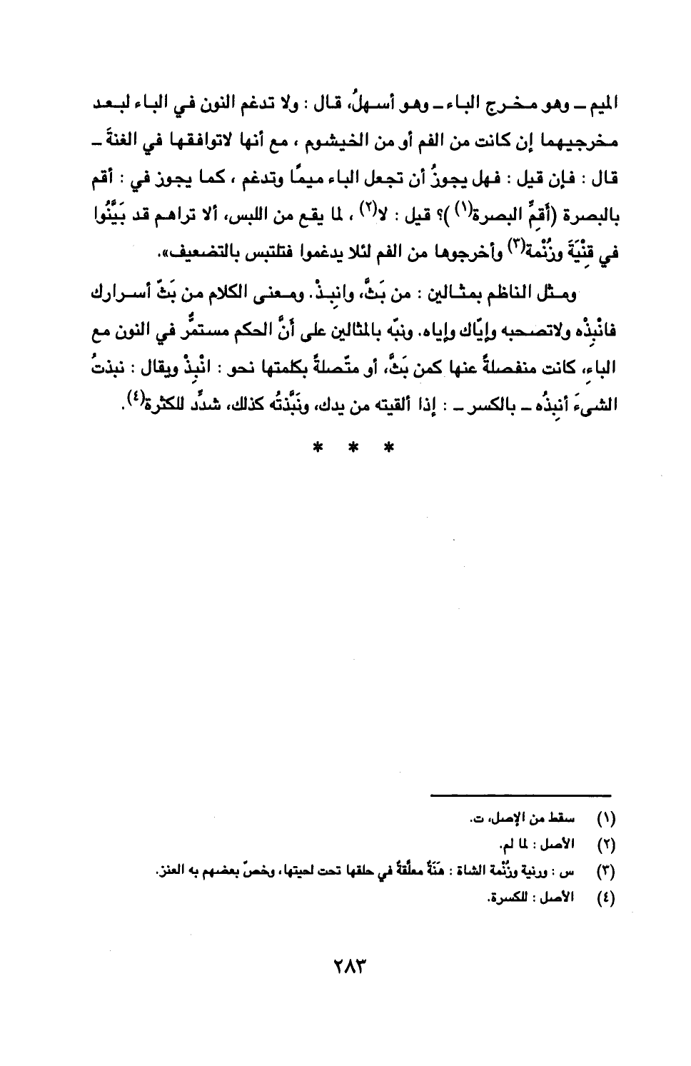 الميم- وهو مخرج الباء- وهو أسهل، قال: ولا تدغم النون في الباء لبعد مخرجيهما إن كانت من الفم أو من الخيشوم، مع أنها لا توافقها في الغنة- قال: فإن قيل: فهل يجوز أن تجعل الباء ميما وتدغم، كما يجوز في: أقم بالبصرة (أقم البصرة)؟ قيل: لا، لما يقع من اللبس، ألا تراهم قد بينوا في قنية وزنمة وأخرجوا من الفم لئلا يدغموا فتلتبس بالتضعيف".