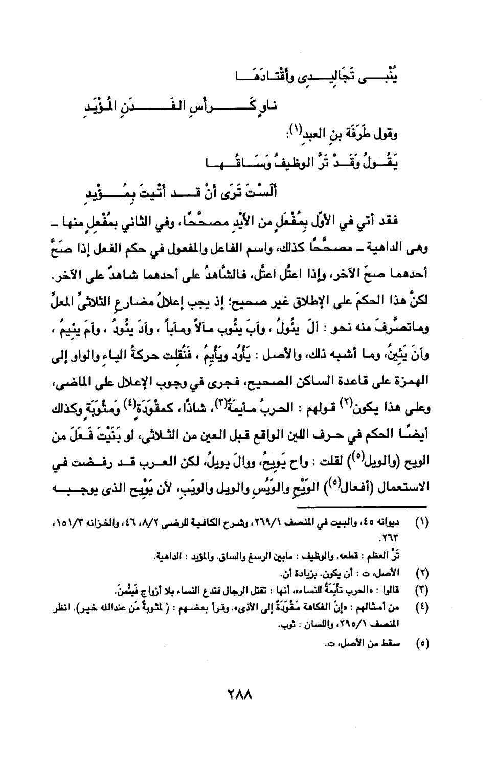 فقد أتي في الأول بمفعل من الأيد مصححا، وفي الثاني بمفعل منها- وهي الداهية- مصححا كذلك، واسم الفاعل والمفعول في حم الفعل إذا صح أحدهما صح الآخر، وإذا اعتل اعتل، فالشاهد على أحدهما شاهد على الآخر. لكن هذا الحكم على الإطلاق غير صحيح؛ إذ يجب إعلال مضارع الثلاثي المعل وما تصرف منه نحو: آل يئول، وآب يئوب مآلا ومآبا، وآد يئود، وآم يئيم، وآن يئين، وما أشبه ذلك، والأصل: يأود ويأيم، فنقلت حركة الياء والواو إلى الهمزة على قاعدة الساكن الصحيح، فجرى في وجوب الإعلال على الماضي، وعلى هذا يكون قولهم: الحرب مأيمة، شاذا، كمقودة ومثوبة وكذلك أيضا الحكم في حرف اللين الواقع قبل العين من الثلاثي، لو بنيت فعل من الويح (والويل) لقلت: واحد يويح، ووال يويل، لكن العرب قد رفضت في الاستعمال (أفعال) الويح والويس والويل والويب، لأن يويح الذي يوجبه