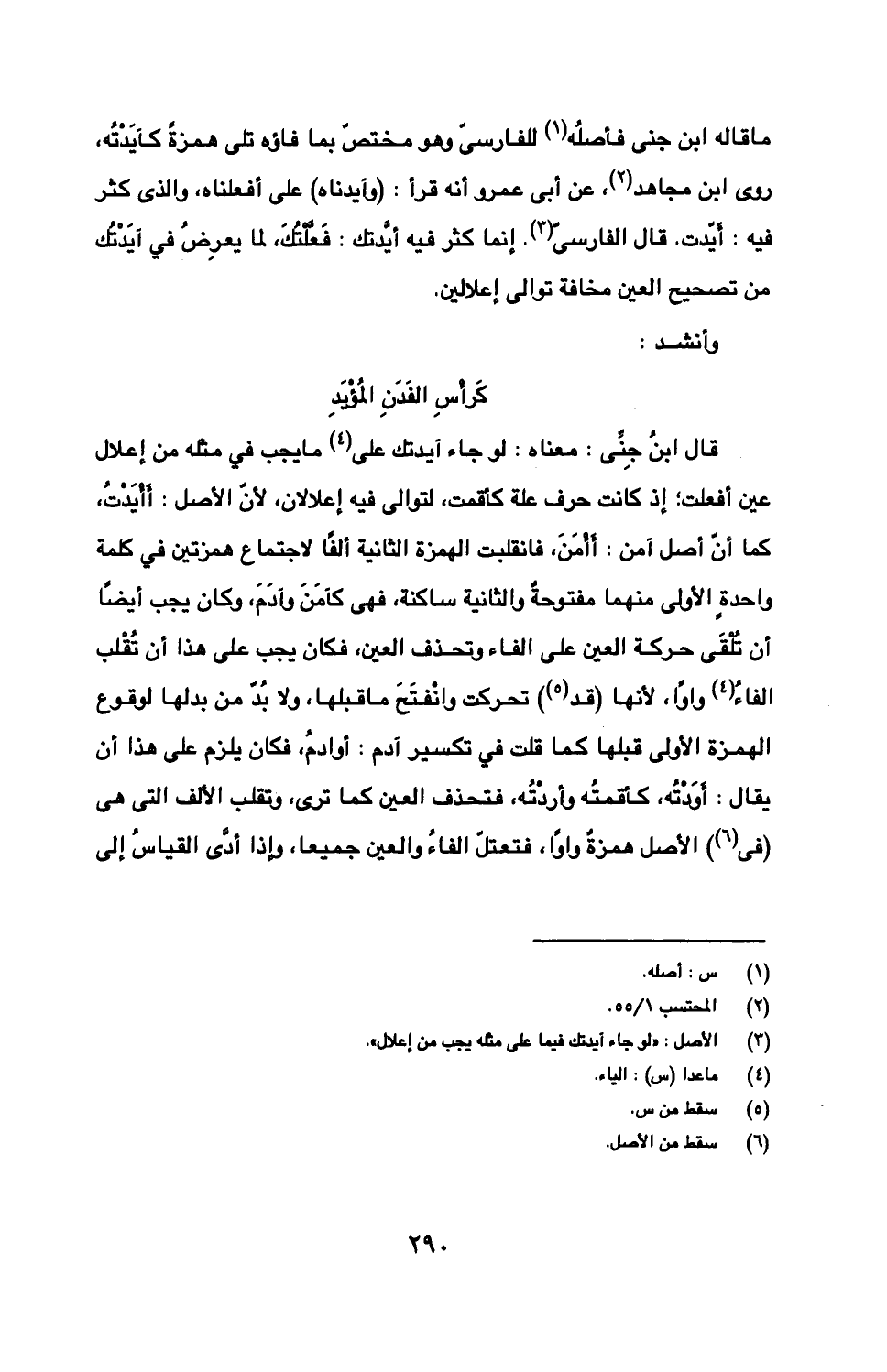 ما قاله ابن جني فأصله للفارسي وهو مختص بما فاؤه تلى همزة كآيدته، روى ابن مجاهد، عن أبي عمرو أنه قرأ: (وآيدناه) على أفعلناه، والذي كثر فيه: أيدت. قال الفارسي. إنما كثر فيه أيدتك: فعلتك، لما يعرض في آيدتك من تصحيح العين مخافة توالي إعلالين.