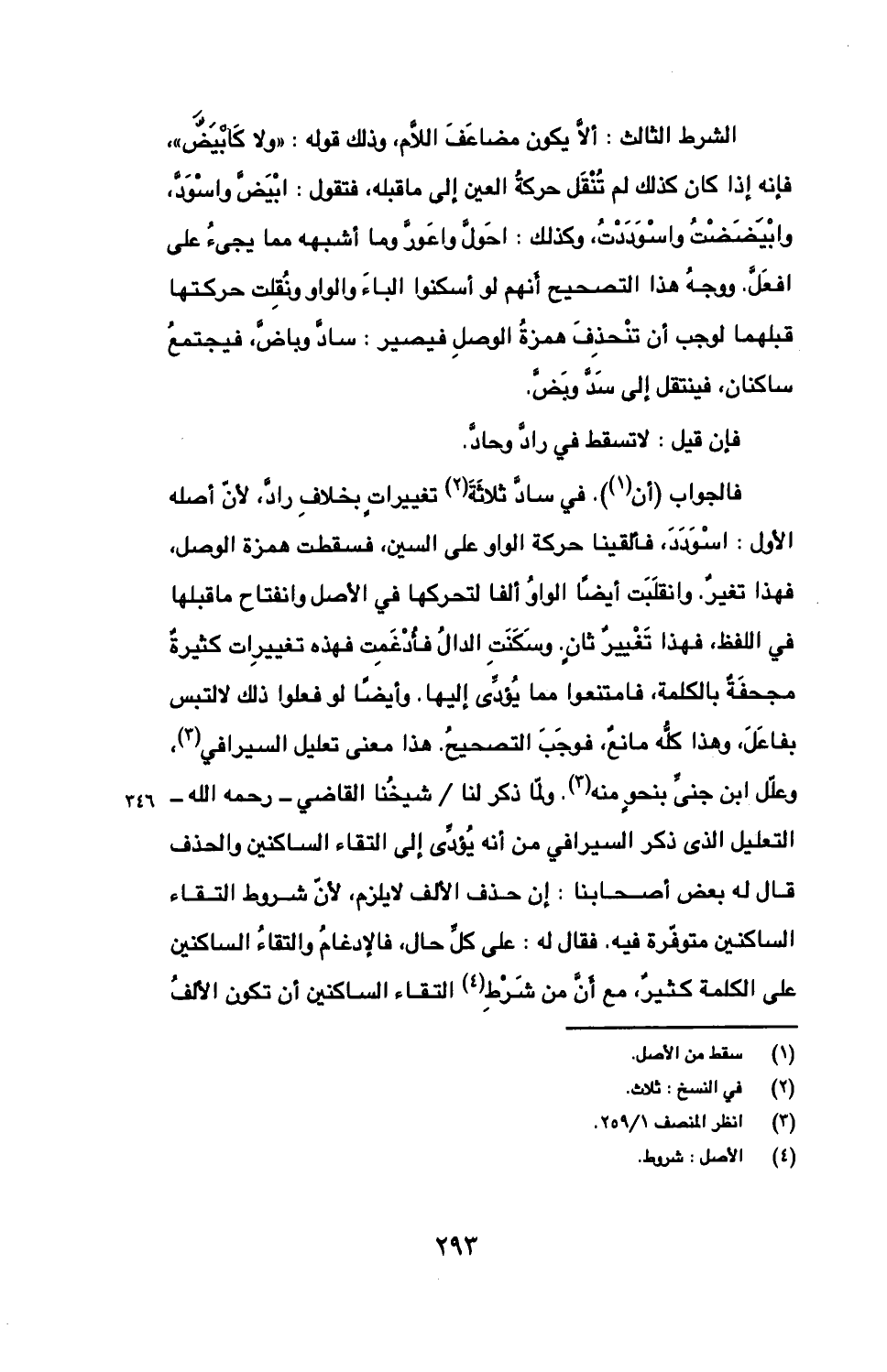 فالجواب (أن). في ساد ثلاثة تغييرات بخلاف راد، لأن أصله الأول: اسودد، فألقينا حركة الواو على السين، فسقطت همزة الوصل، فهذا تغير. وانقلبت أيضا الواو ألفا لتحركها في الأصل وانفتاح ما قبلها في اللفظ، فهذا تغيير ثان. وسكنت الدال فأدغمت فهذه تغييرات كثيرة مجحفة بالكلمة، فامتنعوا مما يؤدي إليها. وأيضا لو فعلوا ذلك لالتبس بفاعل، وهذا كله مانع، فوجب التصحيح. هذا معنى تعليل السيرافي، وعلل ابن جني بنحو منه. ولما ذكر لنا/ شيخنا القاضي- رحمه الله- التعليل الذي ذكر السيرافي من أنه يؤدي إلى التقاء الساكنين والحذف قال له بعض أصحابنا: إن حذف الألف لا يلزم، لأن شروط التقاء الساكنين متوفرة فيه. فقال له: على كل حال، فالإدغام والتقاء الساكنين على الكلمة كثير، مع أن من شرط التقاء الساكنين أن تكون الألف