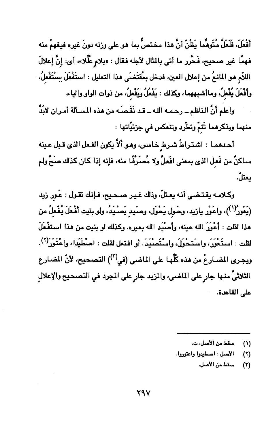 وكلامه يقتضي أنه يعتل، وذلك غير صحيح، فإنك تقول: عور زيد (يعور)، واعور يا زيد، وحول يحول، وصيد يصيد، ولو بنيت أفعل يفعل من هذا لقلت: أعو الله عينه، وأصيد الله بعيره. وكذلك لو بنيت من هذا استفعل لقلت: استعور، واستحول، واستصيد. أو افتعل لقلت: اصطيدا، واعتور.