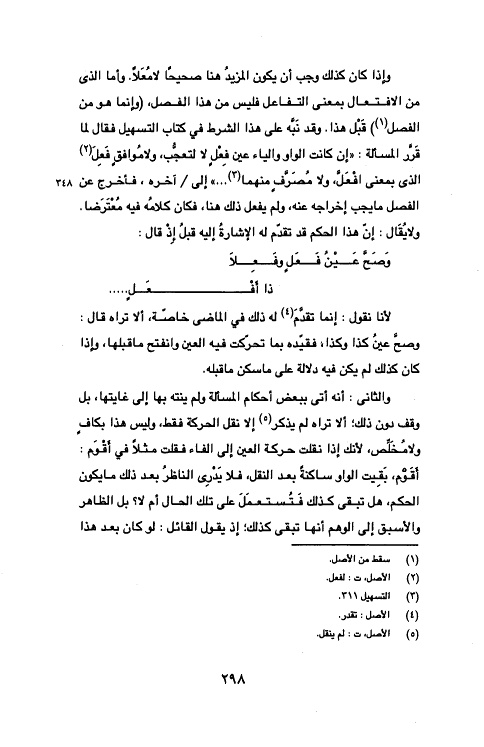 وإذا كان كذلك وجب أن يكون المزيد هنا صحيحا لامعلا. وأما الذي من الافتعال بمعنى التفاعل فليس من هذا الفصل، (وإنما هو من الفصل) قبل هذا. وقد نبه على هذا الشرط في كتاب التسهيل فقال لما قرر المسألة: "إن كانت الواو والياء عين فعل لا لتعجب، ولا موافق فعل الذي بمعنى افعل، ولا مصرف منهما ... " إلى/ آخره، فأخرج عن الفصل ما يجب إخراجه عنه، ولم يفعل ذلك هنا، فكان كلامه فيه معترضا.
