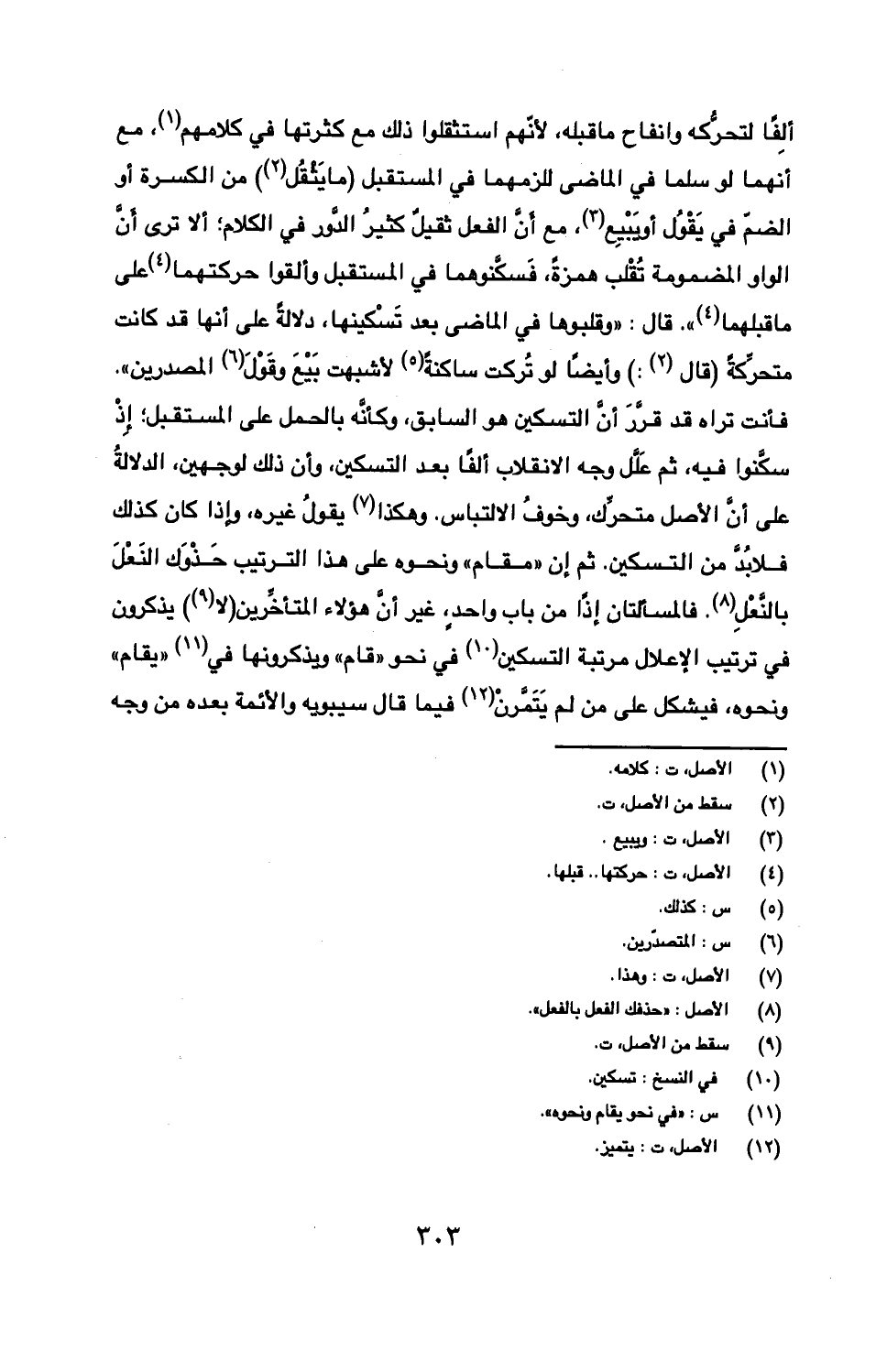 ألفًا لتحركه وانفتاح ما قبله، لأنهم استثقلوا ذلك مع كثرتها في كلامهم، مع أنها لو سلما في الماضي للزمهما في المستقبل (ما يثقل) من الكسرة أو الضم في يقول أو يبيع، مع أن الفعل ثقيل كثير الدور في الكلام؛ ألا ترى أن الواو المضمومة تقلب همزة، فسكونهما في المستقبل وألقوا حركتهما على ما قبلهما". قال: "وقلبوها في الماضي بعد تسكينها، دلالة على أنها قد كانت متحركة (قال: ) وأيضا لو تركت ساكنة لأشبهت بيع وقول المصدرين". فأنت تراه قد قرر أن التسكين هو السابق، وكأنه بالحمل على المستقبل؛ إذ سكنوا فيه، ثم علل وجه الانقلاب ألفا بعد التسكين، وأن ذل لوجهين، الدلالة على أن الأصل متحرك، وخوف الالتباس، وأن ذلك لوجهين، الدلالة على أن الأصل متحرك، وخوف الالتباس. وهكذا يقول غيره، وإذا كان كذلك فلابد من التسكين. ثم إن "مقام" ونحوه على هذا الترتيب حذوك النعل بالنعل. فالمسألتان إذا من باب واحد، غير أن هؤلاء المتأخرين (لا) يذكرون في ترتيب الإعلال مرتبة التسكين في نحو (قام) ويذكرونها في (يقام) ونحوه، فيشكل على من لم يتمرن فيما قال سيبويه والأئمة بعده من وجه