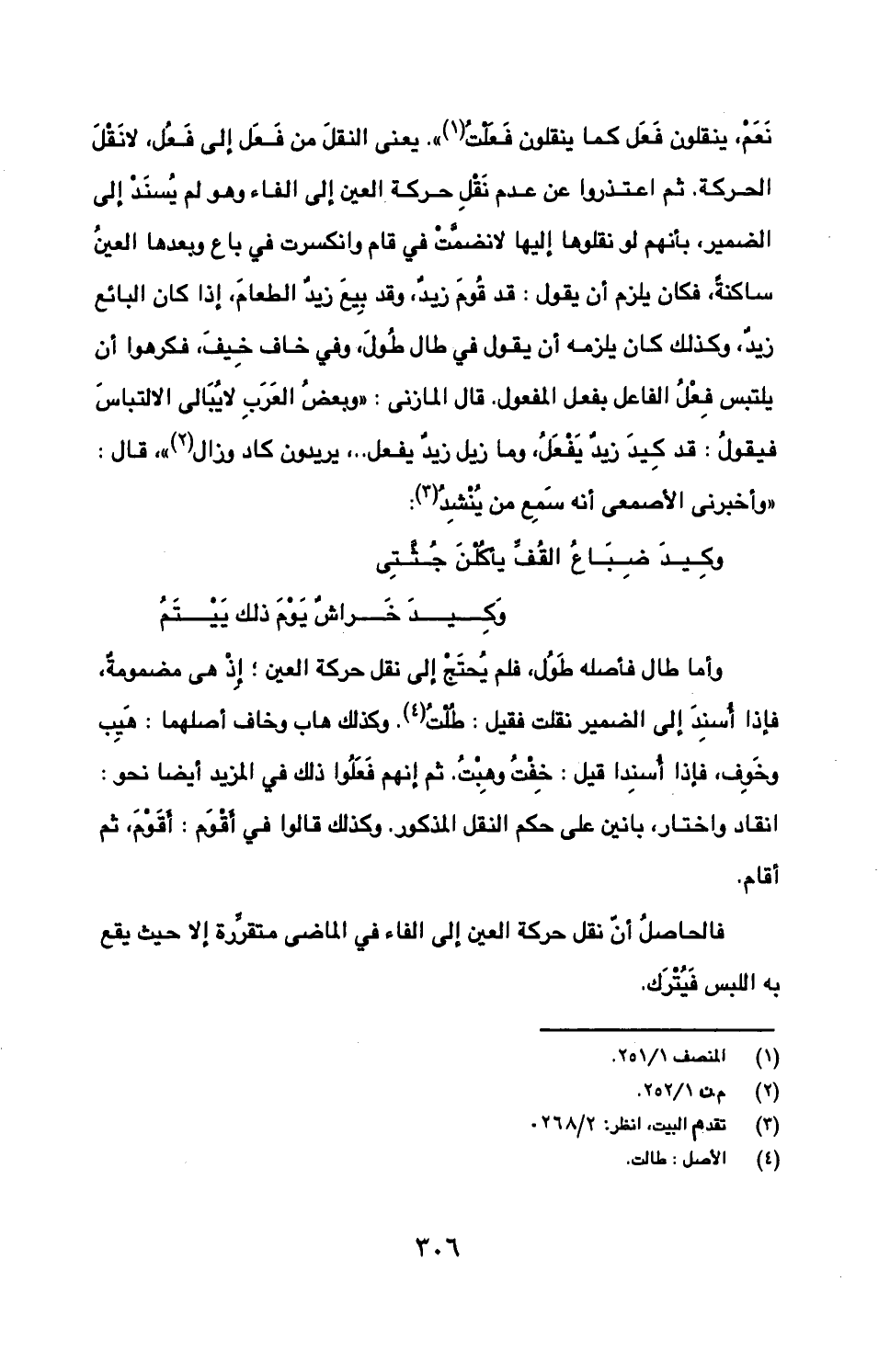 نعم، ينقلون فعل كما ينقلون فعلت". يعني النقل من فعل إلى فعل، لا نقل الحركة. ثم اعتذروا عن عدم نقل حركة العين إلى الفاء وهو لم يسند إلى الضمير، بأنهم لو نقلوها إليها لانضمت في قام وانكسرت في باع وبعدها العين ساكنة، فكان يلزم أن يقول: قد قوم زيد، وقد بيع زيد الطعام، إذا كان البائع زيد، وكذلك كان يلزمه أن يقول في طال طول، وفي خاف خيف، فكرهوا أن يلتبس فعل الفاعل بفعل المفعول، قال المازني: "وبعد العرب لا يبالي الالتباس فيقول: قد كيد زيد يفعل، وما زيد زيد يفعل .. ، يريدون كاد وزال"، قال: "وأخبرني الأصمعي أنه سمع من ينشد: