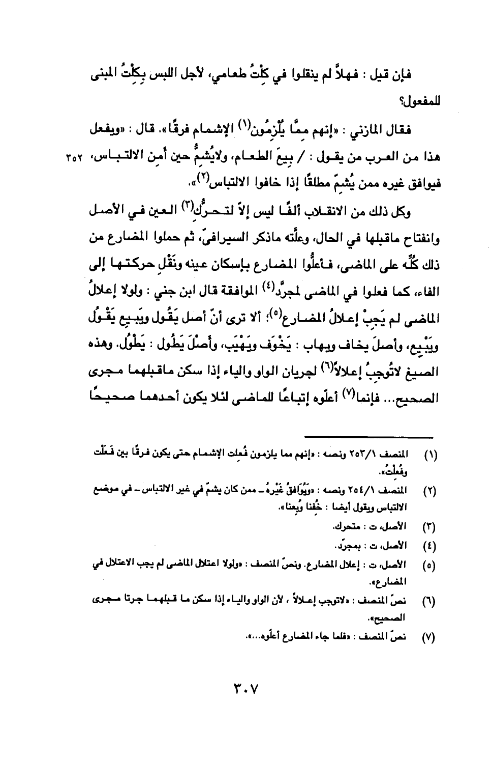 فقال المازني: "إنهم مما يلزمون الإشمام فرقا". قال: "ويفعل هذا من العرب من يقول: /بيع الطعام، ولا يشم حين أمن الالتباس، فيوافق غيره ممن يشم مطلقا إذا خافوا الالتباس".