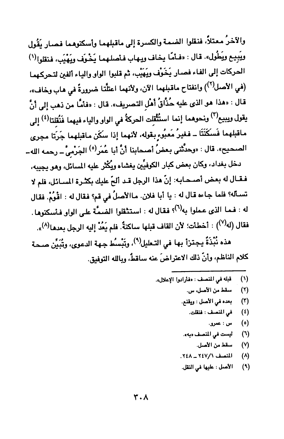 والآخر معتلا، فنقلوا الضمة والكسرة إلى ما قبلهما وأسكنوهما فصار يقول ويبيع ويطول". قال: "فأما يخاف ويهاب فأصلهما يخوف ويهيب، فنقلوا الحركات إلى الفاء فصار يخوف ويهيب، ثم قلبوا الواو والياء ألفين لتحركهما (في الأصل) وانفتاح ما قبلهما الآن، ولأنهما اعتلتا ضرورة في هاب وخاف"، قال: "هذا هو الذي عليه حذاق أهل التصريف". قال: "فأما من ذهب إلى أن يقول ويبيع ونحوهما إنما استثقلت الحركة في الواو والياء فيهما فنقلتا إلى ما قبلهما فسكنتا- فغير معبوء بقوله، لأنهما إذا سكن ما قبلهما جرتا مجرى الصحيح". قال: "وحدثني بعض أصحابنا أن أبا عمر الجرمي- رحمه الله- دخل بغداد، وكان بعض كبار الكوفيين يغشاه ويكثر عليه المسائل، وهو يجيبه، فقال له بعض أصحابه: إن هذا الرجل قد ألح عليك بكثرة المسائل، فلم لا تسأله؟ فلما جاءه قال له: يا أبا فلان، ما الأصل في قم؟ فقال له: أقوم. فقال له: فما الذي عملوا به؟ فقال له: استثقلوا الضمة على الواو فأسكنوها. فقال (له): أخطأت؛ لأن القاف قبلها ساكنة. فلم يعد إليه الرجل بعدها".