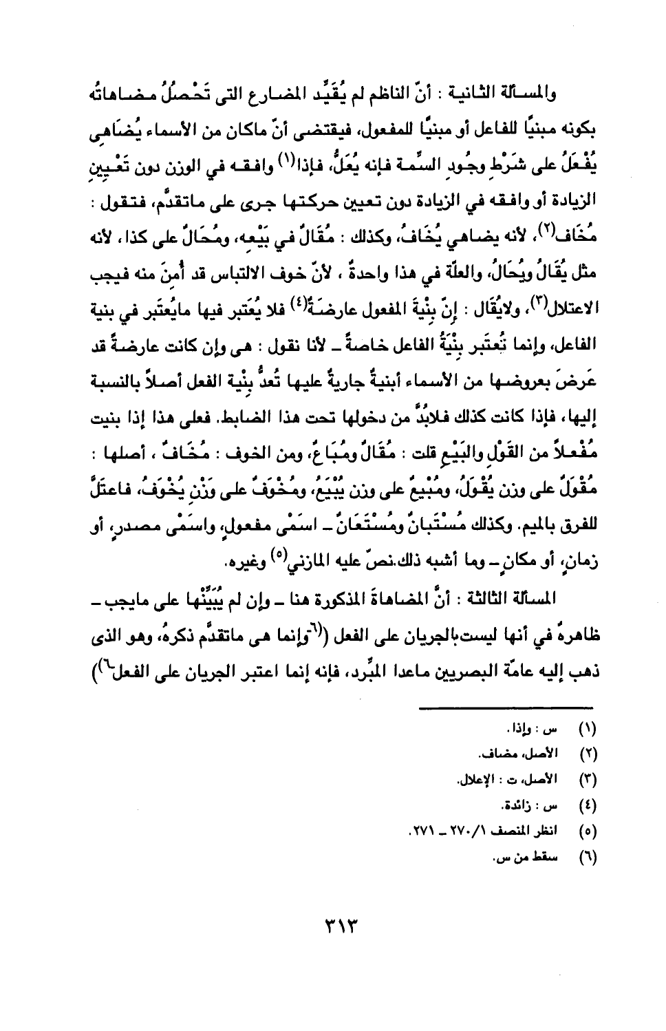 المسألة الثالثة: أن المضاهاة المذكورة هنا- وإن لم يبينها على ما يجب- ظاهره في أنها ليست بالجريان على الفعل (وإنما هي ما تقدم ذكره، وهو الذي ذهب إليه عامة البصريين ما عدا المبرد، فإنه إنما اعتبر الجريان على الفعل)