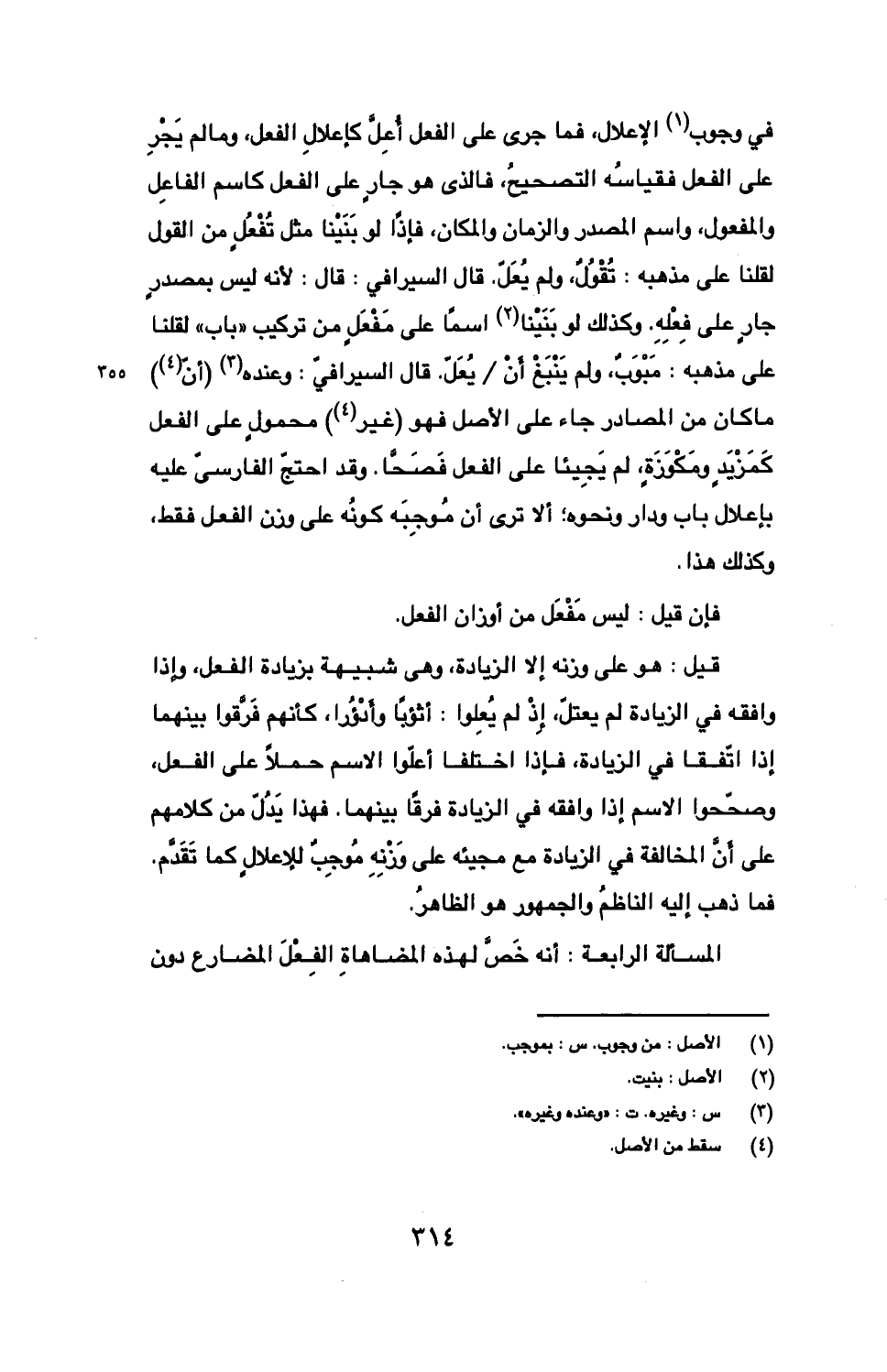 في وجوب الإعلال، فما جرى على الفعل أعل كإعلال الفعل، وما لم يجر على الفعل فقياسه التصحيح، فالذي هو جار على الفعل كاسم الفاعل والمفعول، واسم المصدر والزمان والمكان، فإذا لو بنينا مثل تفعل من القول لقلنا على مذهبه: تقول، ولم يعل. قال السيرافي: قال: لأنه ليس بمصدر جار على فعله. وكذلك لو بنينا اسما على مفعل من تركيب "باب" لقلنا على مذهبه: مبوب، ولم ينبغ أن/ يعل. قال السيرافي: وعنده (أن) ما كان من المصادر جاء على الأصل فهو (غير) محمول على الفعل كمزيد ومكوزة، لم يجيئا على الفعل فصحا. وقد احتج الفارسي عليه بإعلال باب ودار ونحوه؛ ألا ترى أن موجبه كونه على وزن الفعل فقط، وكذلك هذا.