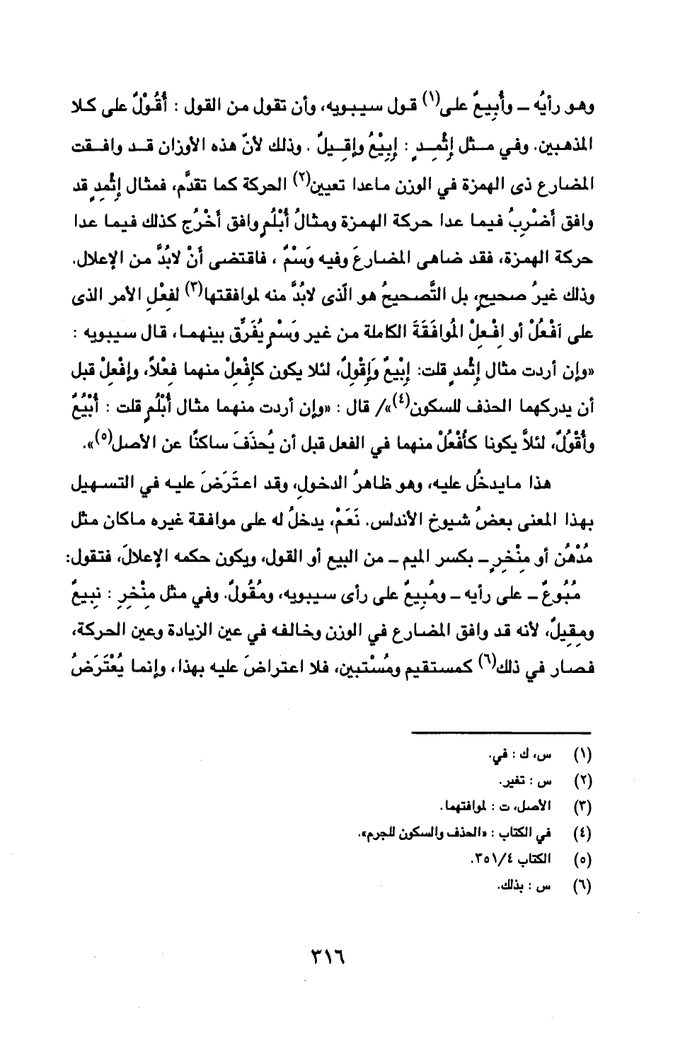 وهو رأيه- وأبيع على قول سيبويه، وأن تقول من القول: أقول على كلا المذهبين. وفي مثل إتمد: إبيع وإقيل. وذلك لأن هذه الأوزان قد وافقت المضارع ذي الهمزة في الوزن ما عدا تعيين الحركة كما تقدم، فمثال إتمد قد وافق أضرب فيما عدا حركة الهمزة، فقد ضاهى المضارع وفيه وسم، فاقتضى أن لابد من الإعلال. وذلك غير صحيح، بل التصحيح هو الذي لابد منه لموافقتها لفعل الأمر الذي على أفعل أو افعل الموافقة الكاملة من غير وسم يفرق بينهما، قال سيبويه: "وإن أردت مثال إتمد قلت: إبيع وإقول، لئلا يكون كإفعل منهما فعلا، وإفعل قبل أن يدركهما الحذف للسكون" قال: "وإن أردت منهما مثال أبلم قلت: أبيع وأقول، لئلا يكونا كأفعل منهما في الفعل قبل أن يحذف ساكنا عن الأصل".