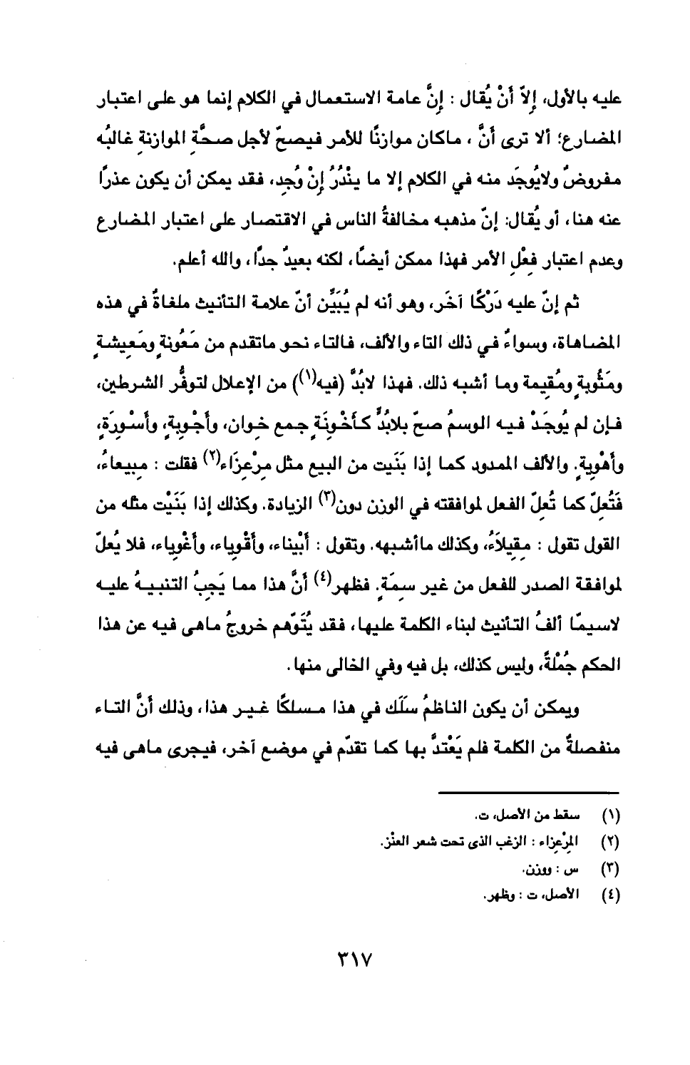 ثم إن عليه دركا آخر، وهو أنه لم يبين أن علامة التأنيث ملغاة في هذه المضاهاة، وسواء في ذلك التاء والألف، فالتاء نحو ما تقدم من معونة ومعيشة ومثوبة ومقيمة وما أشبه ذلك، فهذا لابد (فيه) من الإعلال لتوفر الشرطين، فإن لم يوجد فيه الوسم صح بلا بد كأخونة جمع خوان، وأجوبة، وأسورة، وأهوية. والألف الممدود كما إذا بنيت من البيع مثل مرعزاء فقلت: مبيعاء، فتعل كما تعل الفعل لموافقته في الوزن دون الزيادة. وكذلك إذا بنيت مثله من القول تقول: مقيلاء، وكذلك ما أشبهه. وتقول: أبيناء، وأقوياء، وأغوياء، فلا يعل لموافقة الصدر للفعل من غير سمة. فظهر أن هذا مما يجب التنبيه عليه لاسيما ألف التأنيث لبناء الكلمة عليها، فقد يتوهم خروج ما هي فيه عن هذا الحكم جملة، وليس كذلك، بل فيه وفي الخالي منها.