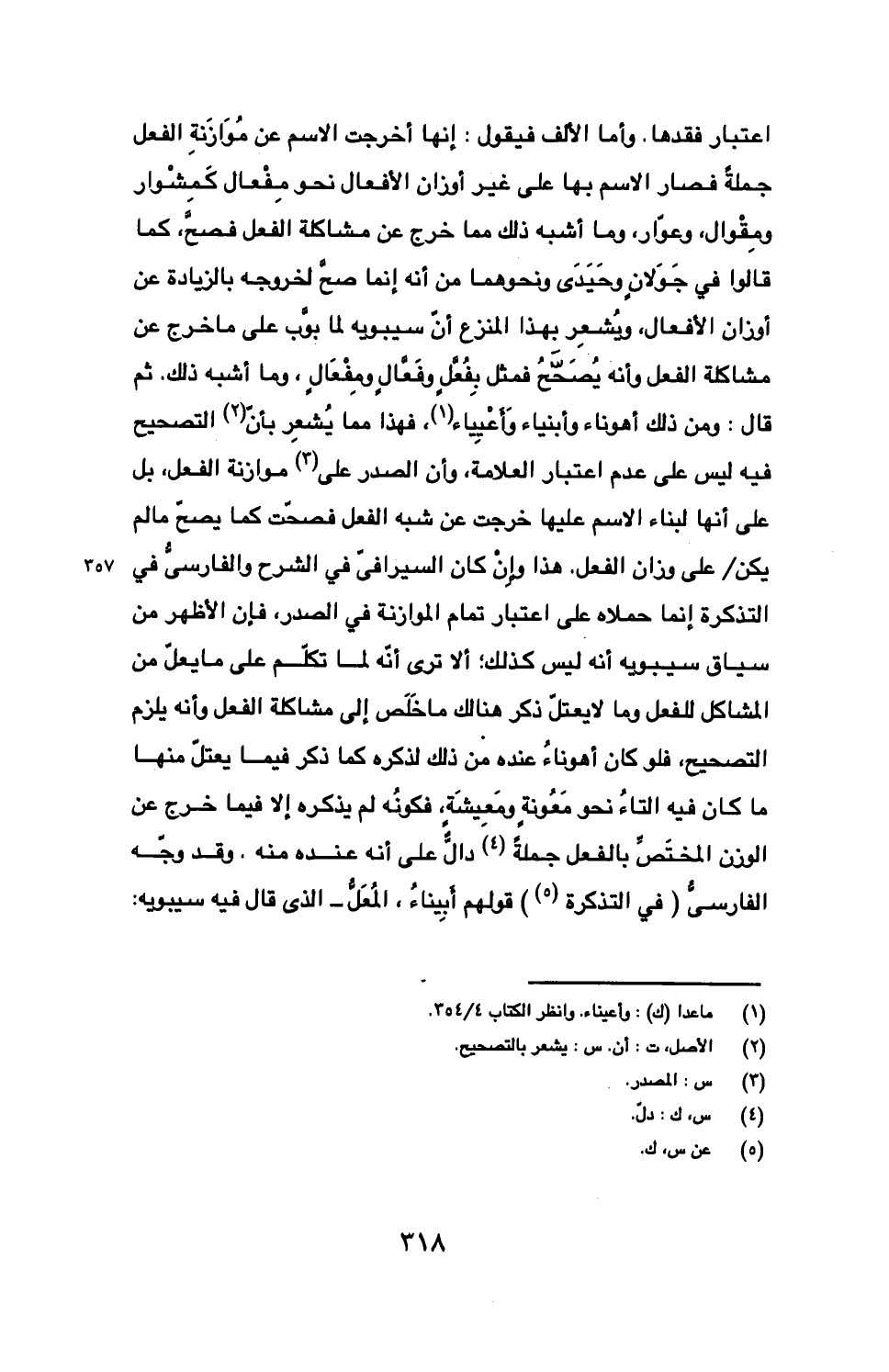 اعتبار فقدها. وأما الألف فيقول: إنها أخرجت الاسم عن موازنة الفعل جملة فصار الاسم بها على غير أوزان الأفعال نحو مفعال كمشوار ومقوال، وعوار، وما أشبه ذلك مما خرج عن مشاكلة الفعل فصح، كما قالوا في جولان وحيدي ونحوهما من أنه إنما صح لخروجه بالزيادة عن أوزان الأفعال، ويشعر بهذا المنزع أن سيبويه لما بوب على ما خرج عن مشاكلة الفعل وانه يصحح فمثل بفعل وفعال ومفعال، وما أشبه ذلك. ثم قال: ومن ذلك أهوناء وأبنياء وأعيياء. فهذا مما يشعر بأن التصحيح فيه ليس على عدم اعتبار العلامة، وأن الصدر على موازنة الفعل، بل على أنها لبناء الاسم عليها خرجت عن شبه الفعل فصحت كما يصح ما لم يكن/ على وزان الفعل. هذا وإن كان السيرافي في الشرح والفارسي في التذكرة إنما حملاه على اعتبار تمام الموازنة في الصدر، فإن الأظهر من سياق سيبويه أنه ليس كذلك؛ ألا ترى أنه لما تكلم على ما يعل من المشاكل للفعل وما لا يعتل ذكر هنالك ما خلص إلى مشاكلة الفعل وأنه يلزم التصحيح، فلو كان أهوناء عنده من ذلك لذكره كما ذكر فيما يعتل منها ما كان فيه التاء نحو معونة ومعيشة، فكونه لم يذكره إلا فيما خرج عن الوزن المختص بالفعل جملة دال على أنه عنده منه. وقد وجه الفارسي (في التذكرة) قولهم أبيناء، المعل- الذي قال فيه سيبويه: