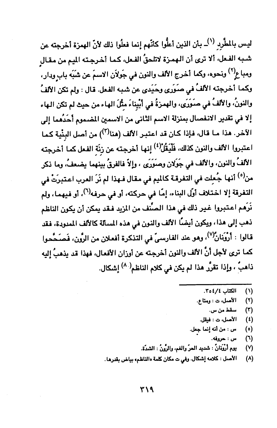 ليس بالمطرد- بان الذين أعلوا كأنهم إنما فعلوا ذلك لأن الهمزة أخرجته عن شبه الفعل، ألا ترى أن الهمزة لا تلحق الفعل، كما أخرجته الميم من مقال ومباع ونحوه، وكما أخرج الألف والنون في جولان الاسم عن شبه باب ودار، وكما أخرجته الألف في صوري وحيدي عن شبه الفعل. قال: ولم تكن الألف والنون، والألف في صوري، والهمزة في أبيناء مثل الهاء من حيث لم تكن الهاء إلا في تقدير الانفصال بمنزلة الاسم الثاني من الاسمين المضموم أحدهما إلى الآخر. هذا ما قال، فإذا كان قد اعتبار الألف (هنا) من أصل البنية كما اعتبروا الألف والنون كذلك، فليقل إنها أخرجته عن زنة الفعل كما أخرجت الألف والنون، والألف في جولان وصوري، وإلا فالفرق بينهما يضعف، وما ذكر من أنها جعلت في التفرقة كالميم في مقال فهذا لم نر العرب اعتبرت في التفرقة إلا اختلاف أول البناء، إما في حركته، أو في حرفه، أو فيهما، ولم نرهم اعتبروا غير ذلك في هذا الصنف من المزيد فقد يمكن أن يكون الناظم ذهب إلى هذا، ويكون أيضا الألف والنون في هذه المسألة كالألف الممدودة، فقد قالوا: أرونان، وهو عند الفارسي في التذكرة أفعلان من الرون، فصححوا كما ترى لأجل أن الألف والنون أخرجته عن أوزان الأفعال، فهذا قد يذهب إليه ذاهب، وإذا تقرر هذا لم يكن في كلام الناظم إشكال.