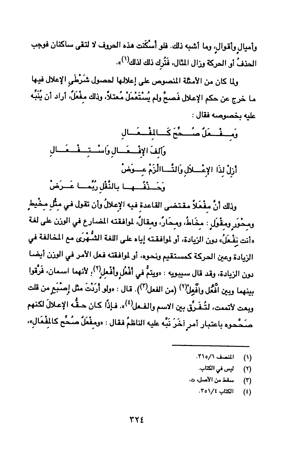 وذلك أن مفعلا مقتضى القاعدة فيه الإعلال وأن تقول في مثل مخيط ومحور ومقول: مخاط، ومحار، ومقال، لموافقته المضارع في الوزن على لغة "أنت تفعل" دون الزيادة، أو لموافقته فعل الأمر في الوزن أيضا دون الزيادة، وقد قال سيبويه "ويتم في أفعل وأفعل؛ لأنهما اسمان، فرقوا بينهما وبين افعل وافعل (من الفعل). قال: "ولو أردت مثل إصبع من قلت وبعت لأتممت، لتفرق بين الاسم والفعل". فإذا كان حقه الإعلال لكنهم صححوه باعتبار أمر آخر نبه عليه الناظم فقال: "ومفعل صحح كالمفعال"،
