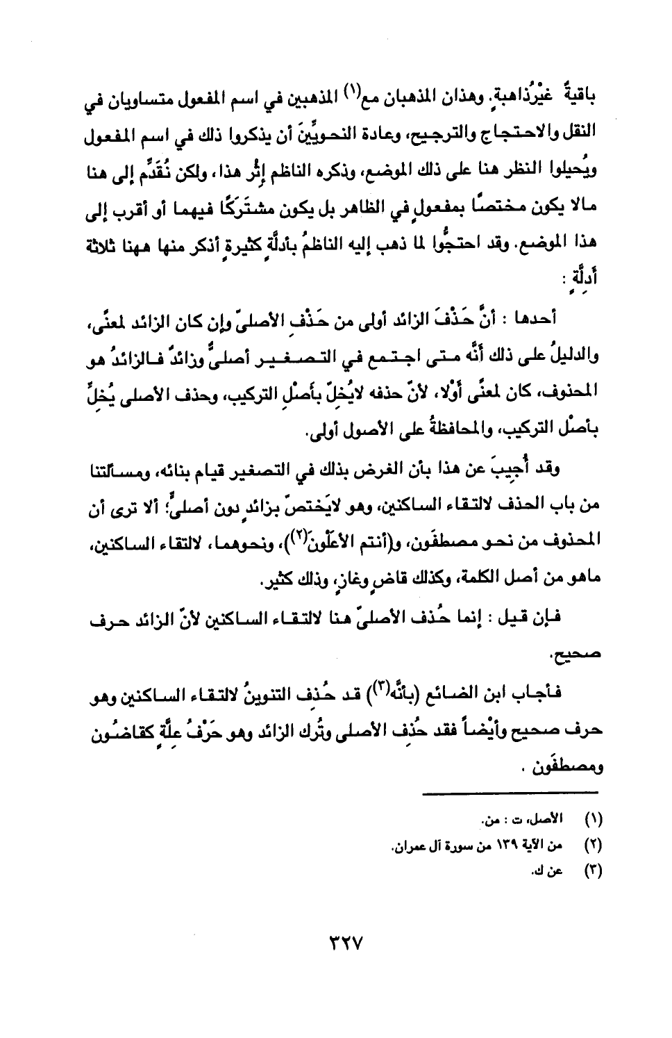 وقد أجيب عن هذا بأن الغرب بذلك في التصغير قيام بنائه، ومسألتنا من باب الحذف لالتقاء الساكنين، وهو لا يختص بزائد دون أصلى؛ ألا ترى أن المحذوف من نحو مصطفون، و (أنتم الأعلون)، ونحوهما، لالتقاء الساكنين، ما هو من أصل الكلمة، وكذلك قاض وغاز، وذلك كثير