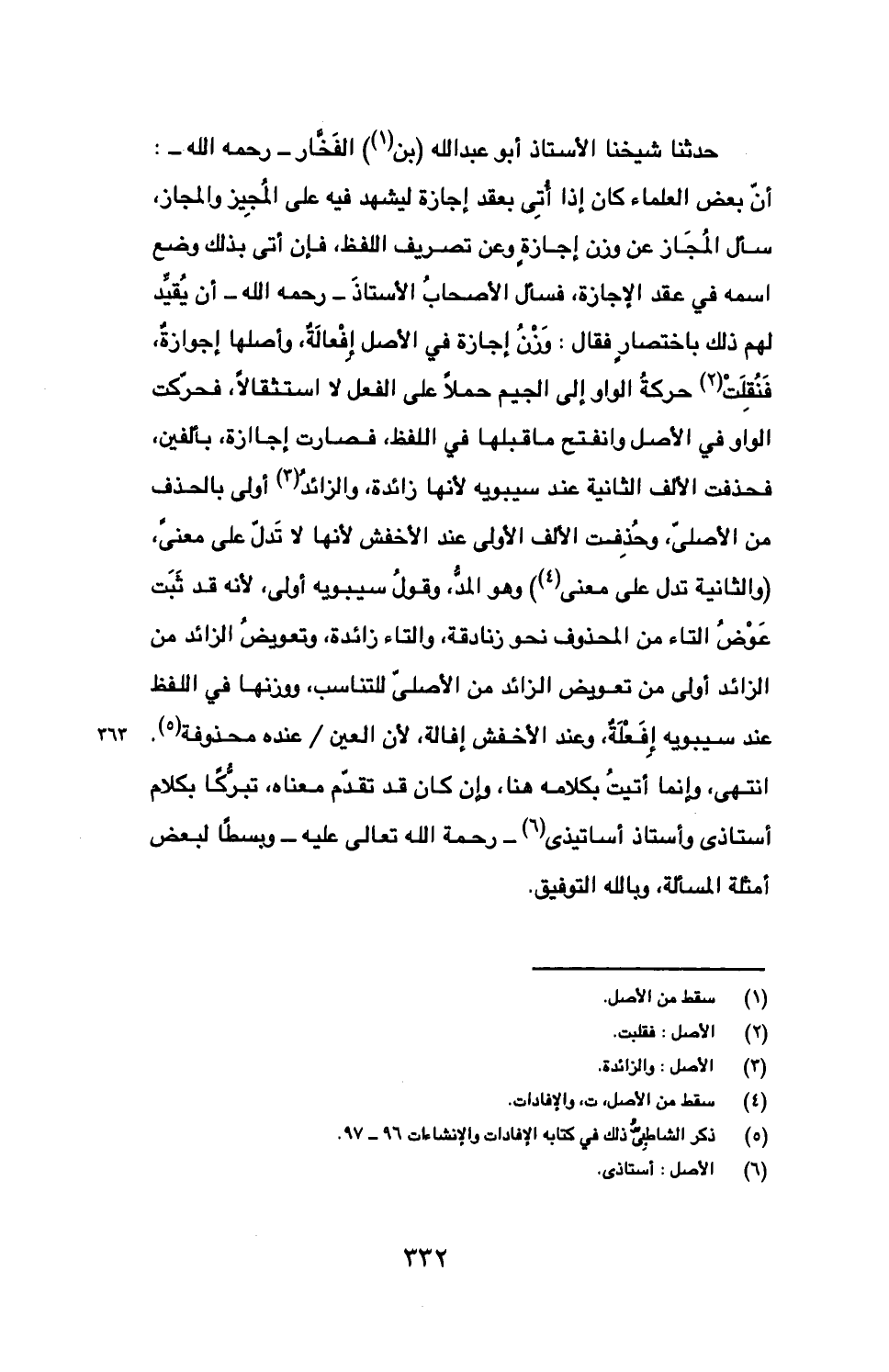 حدثنا شيخنا الأستاذ أبو عبد الله (بن) الفخار- رحمه الله-: أن بعض العلماء كان إذا أتى بعقد إجازة ليشهد فيه على المجيز والمجاز، سأل المجاز عن وزن إجازة وعن تصريف اللفظ، فإن أتى بذلك وضع اسمه في عقد الإجازة، فسأل الأصحاب الأستاذ- رحمه الله- أن يقيد لهم ذلك باختصار فقال: وزن إجازة في الأصل إفعالة، وأصلها إجوازة، فنقلت حركة الواو إلى الجيم حملا على الفعل لا استثقالا، فحركت الواو في الأصل وانفتح ما قبلها في اللفظ، فصارت إجاازة، بألفين، فحذفت الألف الثانية عن سيبويه لأنها زائدة، والزائدة أولى بالحذف من الأصلي، وحذفت الألف الأولى عند الأخفش لأنها لا تدل على معنى، (والثانية تدل على معنى) وهو المد، وقول سيبويه أولى، لأنه قد ثبت عوض التاء من المحذوف نحو زنادقة، والتاء زائدة، وتعويض الزائد من الزائد أولى من تعويض الزائد من الأصلي للتناسب، ووزنها في اللفظ عند سيبويه إفعلة، وعند الأخفش إفالة، لأن العين/ عنده محذوفة. انتهى، وإنما أتيت بكلامه هنا، وإن كان قد تقدم معناه، تبركا بكلام أستاذي وأستاذ أساتيذي- رحمه الله تعالى عليه- وبسطا لبعض أمثلة المسألة، وبالله التوفيق.