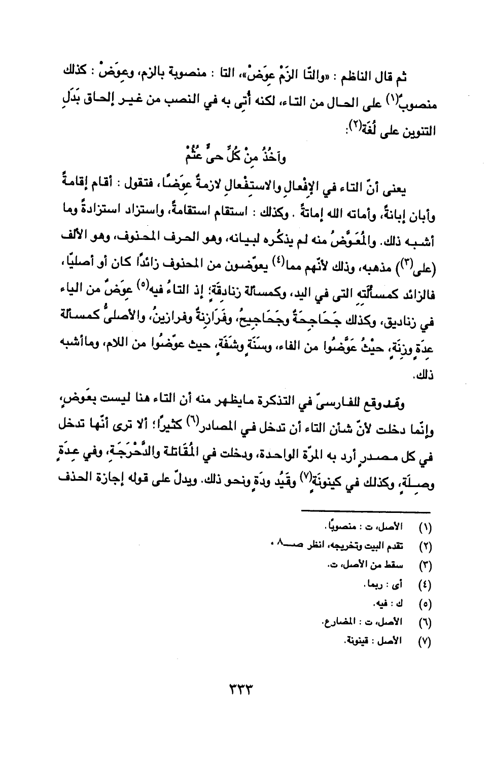 ثم قال الناظم: "والتا الزم عوض" التا: منصوبة بالزم، وعوض: كذلك منصوب على الحال من التاء، لكنه أتى به في النصب من غير إلحاق بدل التنوين على لغة: