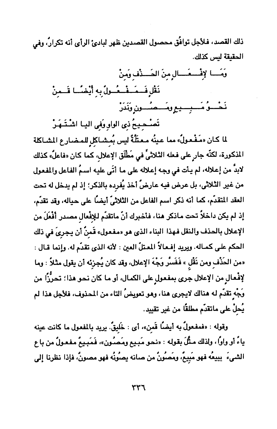 لما كان "مفعول" مما عينه معتلة ليس بمشاكل للمضارع المشاكلة المذكورة، لكنه جار على فعله الثلاثي في مطلق الإعلال، كما كان "فاعل" كذلك لابد من إعلاله، لم يأت في وجه إعلاله على ما أتى عليه اسم الفاعل والمفعول من غير الثلاثي، بل عرض فيه عارض أخذ يفرده بالذكر؛ إذ لم يدخل له تحت العقد المتقدم، كما أنه ذكر اسم الفاعل من الثلاثي أيضا على حياله، وقد تقدم، إذ لم يكن داخلا تحت ما ذكر هنا، فأخبرك أن ما تقدم للإفعال مصدر أفعل من الإعلال بالحذف والنقل فهذا البناء الذي هو "مفعول" قمن أن يجرى في ذلك الحكم على كماله. ويريد إفعالا المعتل العين: لأنه الذي تقدم له. وإنما قال: "من الحذف ومن نقل" ففسر وجه الإعلال، وقد كان يجزئه أن يقول مثلا: وما لإفعال من الإعلال جرى بمفعول على الكمال، أو ما كان نحو هذا؛ تحرزا من وجه له هنالك لا يجرى هنا، وهو التعويض التاء من المحذوف، فلأجل هذا لم يحل على ما تقدم مطلقا من غير تقييد.