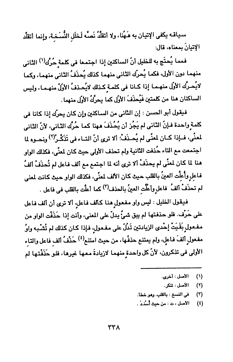 فيقول الخليل: ليس واو مفعول هنا كألف فاعل، ألا ترى أن ألف فاعل على حرف. فلو حذفتها لم يبق شيء يدل على المعنى، وأنت إذا حذفت الواو من مفعول بقيت إحدى الزيادتين تدل على مفعول، فإذا كان كذلك لم تشبه واو مفعول ألف فاعل، ولم يمتنع حذفها، من حيث امتنع حذف ألف فاعل والتاء الأولى في تذكرون، لأن كل واحدة منهما لا زيادة معها غيرها، فلو حذفتها لم