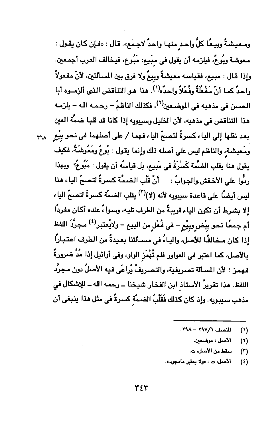 ومعيشة وبيعا كل واحد منها واحد لا جمع". قال "فإن كان يقول: معوشة وبوع، فيلزمه أن يقول في مبيع: مبوع، فيخالف العرب أجمعين. وإذا قال: مبيع، فقياسه معيشة وبيع ولا فرق بين المسألتين، لأن مفعولا واحد ما أن مفعلة وفعلا واحد". هذا هو التناقض الذي ألزموه أبا الحسن في مذهبه في الموضعين، فكذلك الناظم- رحمه الله- يلزمه هذا التناقض في مذهبه، لأن الخليل وسيبويه إذا كانا قد قلبا ضمة العين نقلها إلى الياء كسرة لتصح الياء فهما/ على أصلهما في نحو بيع ومعيشة، والناظم ليس على أصله ذلك وإنما يقول: بوع ومعوشة، فكيف يقول هنا بقلب الضمة كسرة في مبيع، بل قياسه أن يقول: مبوع؟ وبهذا ردوا على الأخفش والجواب: أن قلب الضمة كسرة لتصح الياء هنا ليس أيضا على قاعدة سيبويه لأنه (لا) يقلب الضمة كسرة لتصح الياء إلا بشرط أن تكون الياء قريبة من الطرف تليه، وسواء عنده أكان مفردا أم جما نحو بيض وبيع- في فعل من البيع- ولا يعتبر مجرد اللفظ إذا كان مخالفا للأصل، والياء في مسألتنا بعيدة من الطرف اعتبارا بالأرض، كما اعتبر في العواور فلم تهمز الواو، وفي أوائيل إذا مد ضرورة فهمز؛ لأن المسألة تصريفية، والتصريف يراعى فيه الأصل دون مجرد اللفظ. هذا تقرير الأستاذ ابن الفخار شيخنا- رحمه الله- للإشكال في مذهب سيبويه. وإذ كان كذلك فقلب الضمة كسرة في مثل هذا ينبغي أن