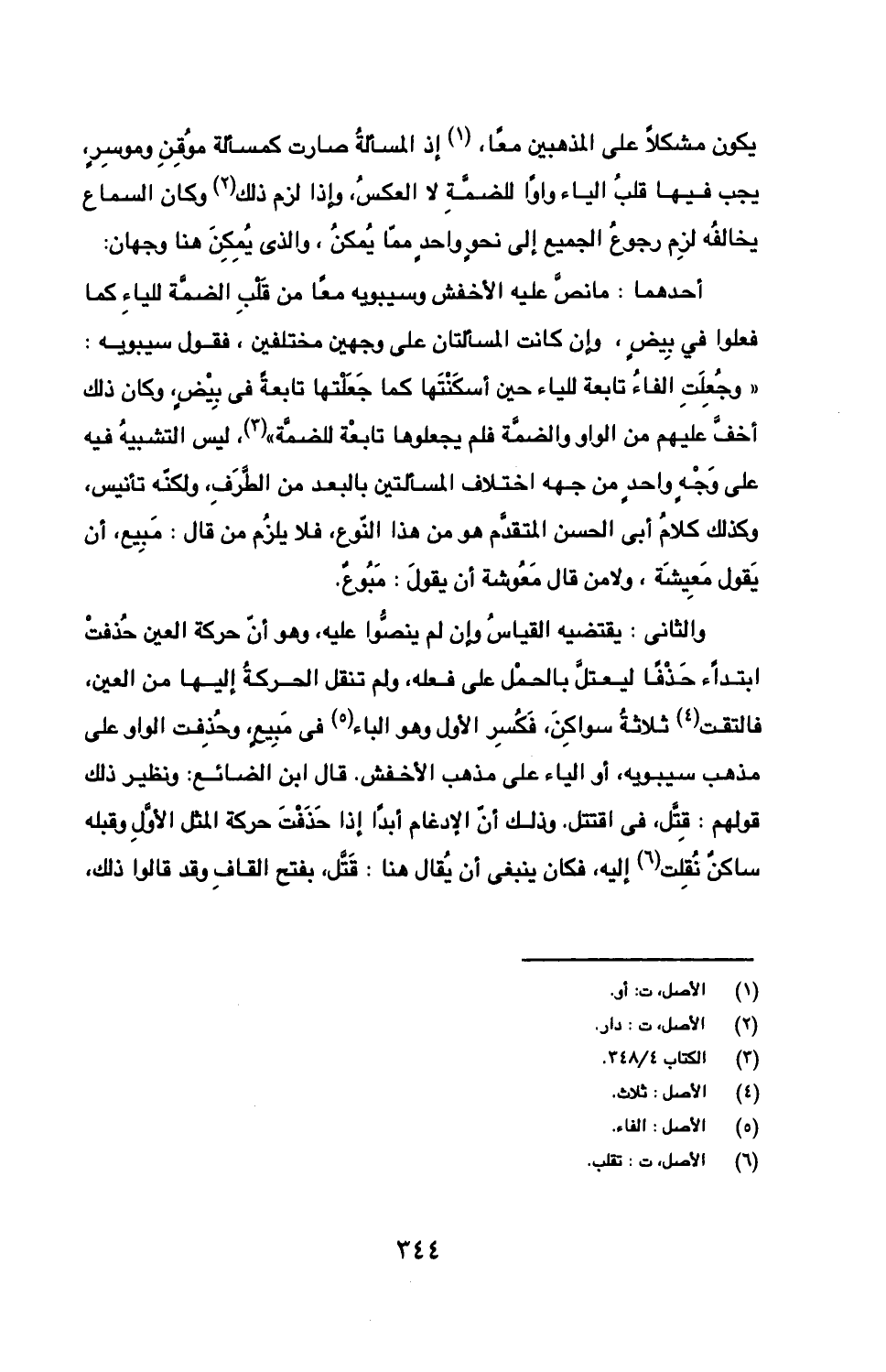 أحدهما: ما نص عليه الأخفش وسيبويه معا من قلب الضمة للياء كما فعلوا في بيض، وإن كانت المسألتان على وجهين مختلفين، فقول سيبويه: "وجعلت الفاء تابعة للياء حين أسكنتها كما جعلتها تابعة في بيض، وكان ذلك أخف عليهم من الواو والضمة فلم يجعلوها تابعة للضمة"، ليس التشبيه فيه على وجه واحد من جهة اختلاف المسألتين بالبعد من الطرف، ولكنه تأنيس، وكذلك كلام أبي الحسن المتقدم هو من هذا النوع، فلا يلزم من قال: مبيع، أن يقول معيشة، ولا من قال معوشة أن يقول: مبوع.