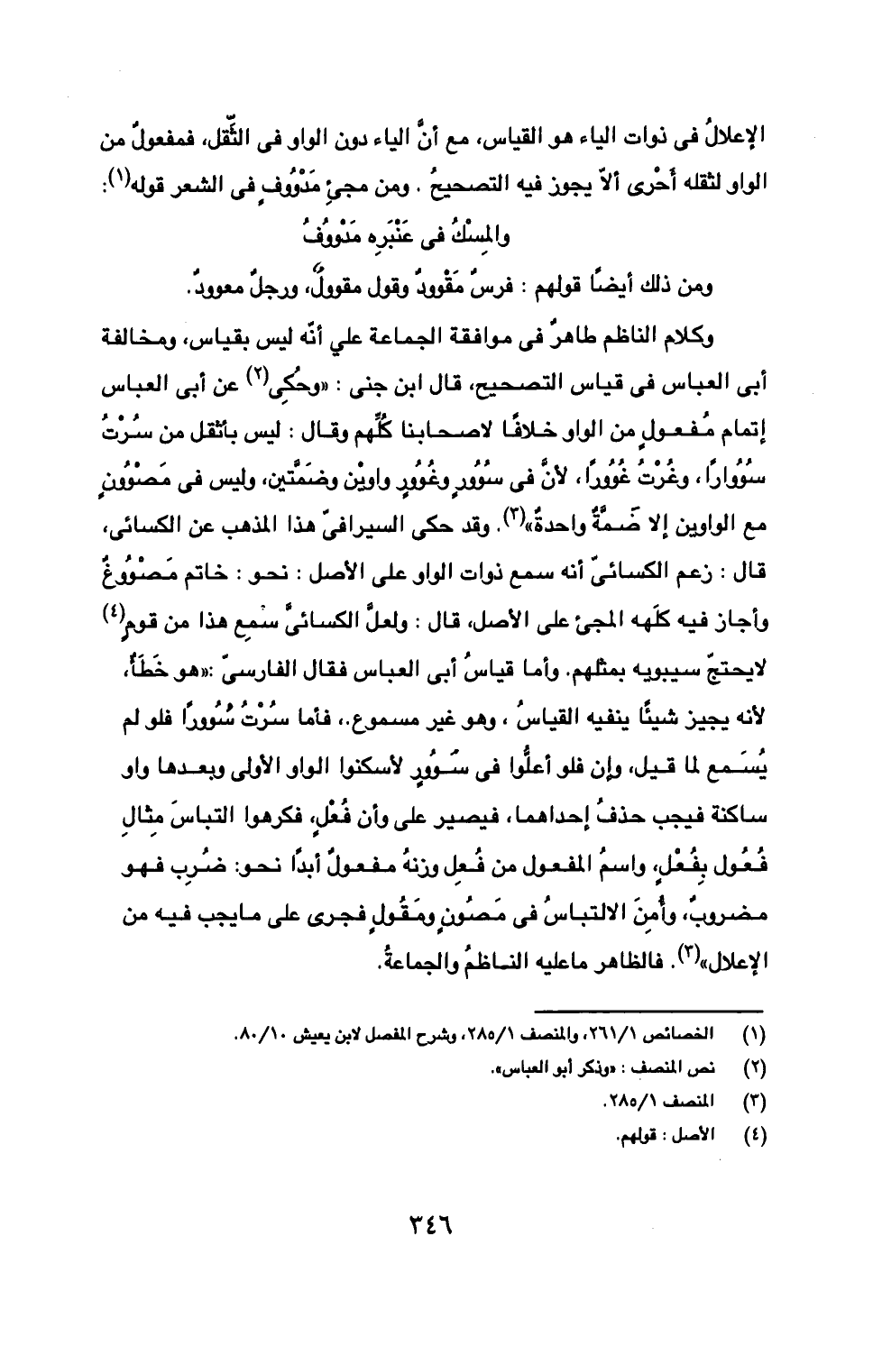 وكلام الناظم طاهر في موافقة الجماعة على أنه ليس بقياس، ومخالفة أبي العباس في قياس التصحيح، قال ابن جنى: "وحكى عن أبي العباس إتمام مفعول من الواو خلافا لاصحابنا كلهم وقال: ليس بأثقل من سرت سووارا، وغرت غوورا، لأن في سوور وغوور واوين وضمتين، وليس في مصوون مع الواوين إلا ضمة واحدة". وقد حكى السيرافي هذا المذهب عن الكسائي، قال: زعم الكسائي أنه سمع ذوات الواو على الأصل: نحو: خاتم مصووغ وأجاز فيه كلهه المجيء على الأصل، قال: ولعل الكسائي سمع هذا من قوم لا يحج سيبويه بمثلهم. وأما قياس أبي العباس فقال الفارسي: "هو خطأ، لأنه يجيز شيئا ينفيه القياس، وهو غير مسموع، فأما سرت سوورا فلو لم يسمع لما قيل، وإن فلو أعلوا في سوور لأسكنوا الواو الأولى وبعدها واو ساكنة فيجب حذف إحداهما، فيصير على وأن فعل، فكرهوا التباس مثال فعول بمفعل، واسم المفعول من فعل وزنه مفعول أبدا نحو: ضرب فهو مضروب، وأمن الالتباس في مصون ومقول فجرى على ما يجب فيه الإعلال". فالظاهر ما عليه الناظم والجماعة.