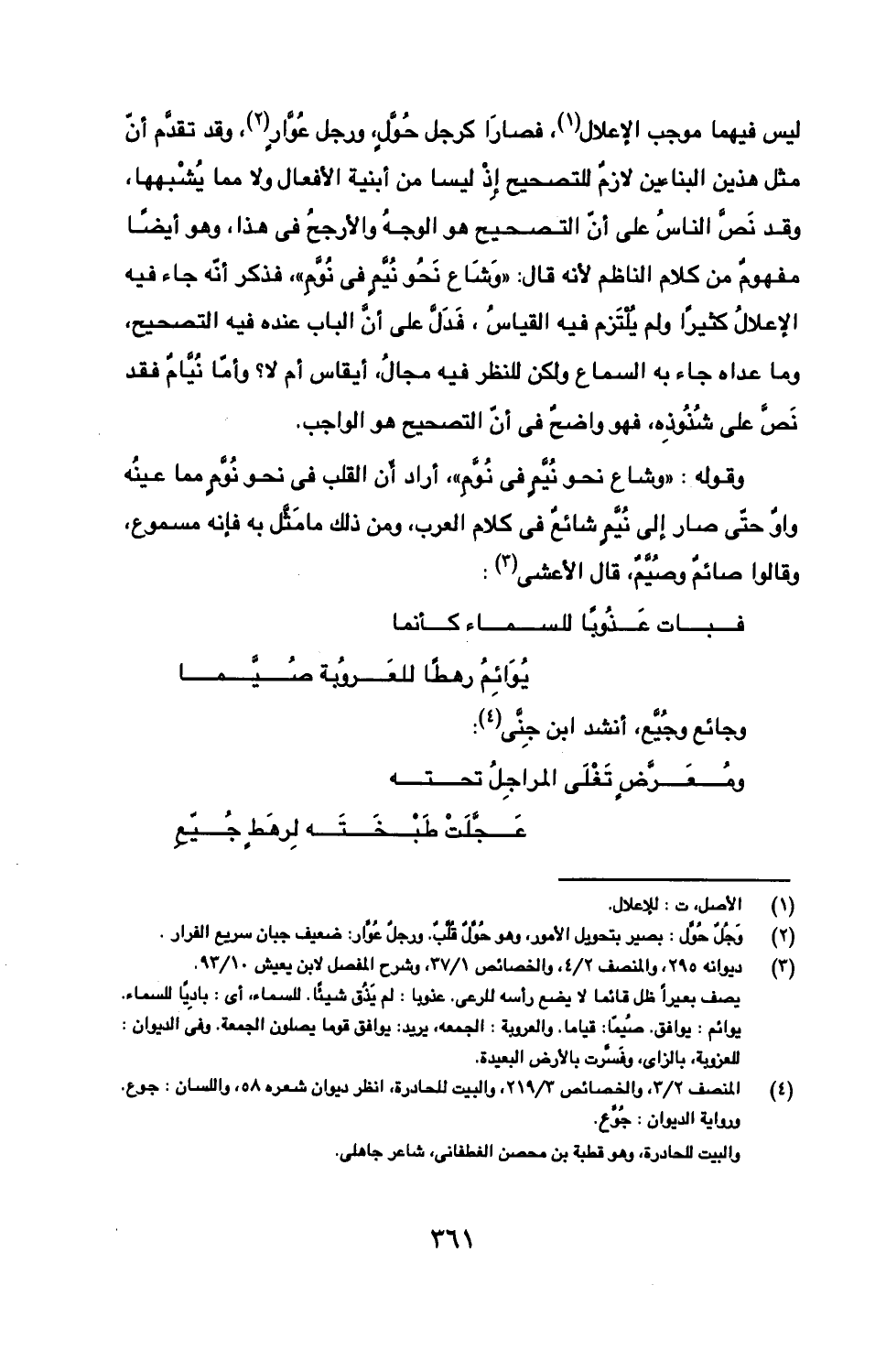 ليس فيهما موجب الإعلال، فصار كرجل حول، ورجل عوار، وقد تقدم أن مثل هذين البناءين لازم للتصحيح إذا ليسا من أبنية الأفعال ولا مما يشبهها، وقد نص الناس على أن التصحيح هو الوجه والأرجح في هذا، وهو أيضا مفهوم من كلام الناظم لأنه قال: "وشاع نحو نيم في نوم"، فذكر أنه جاء فيه الإعلال كثيرا ولم يلتزم فيه القياس، فدل على أن الباب عنده فيه التصحيح، وما عداه جاء به السماع ولكن للنظر فيه مجال، أيقاس أم لا؟ وأما نيام فقد نص على شذوذه، فهو واضح في أن التصحيح هو الواجب.