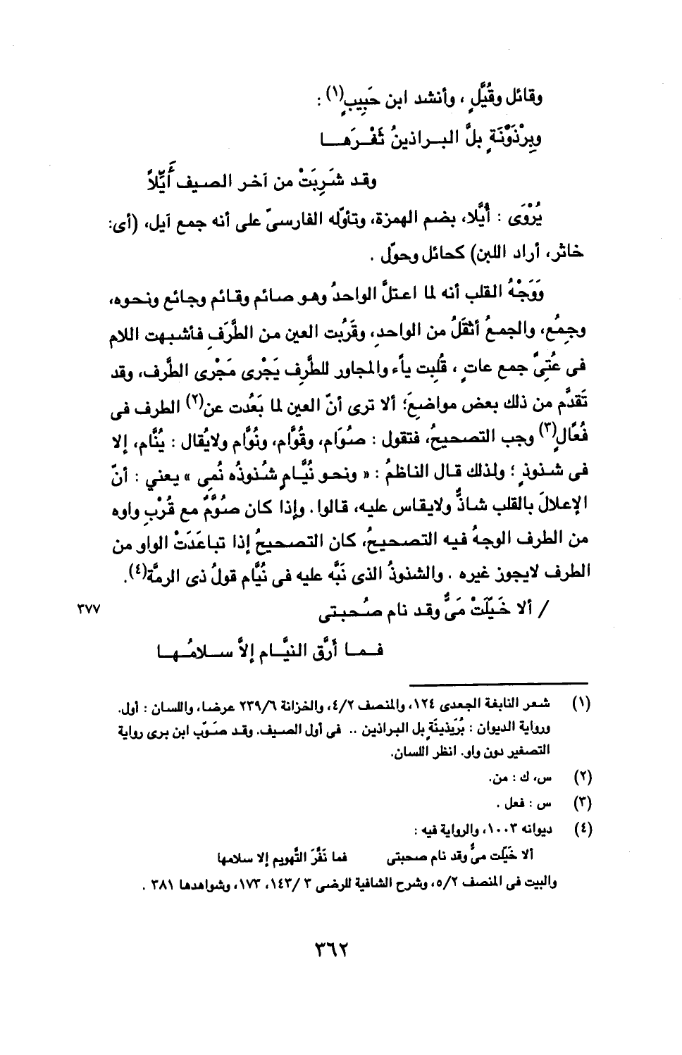 ووجه القلب أنه لما اعتل الواحد وهو صائم وقائم وجائع ونحوه، وجمع، والجمع أثقل من الواحد، وقربت العين من الطرف فأشبهت اللام في عتى جمع عات، قلبت ياء والمجاور للطرف يجرى مجرى الطرف، وقد تقدم من ذلك بعض مواضع؛ ألا ترى أن العين لما بعدت عن الطرف في فعال وجب التصحيح، فتقول: صوام، وقوام، ونوام ولا يقال: ينام، ألا في شذوذ؛ ولذلك قال الناظم: "ونحو نيام شذوذه نمى" يعني: أن الإعلال بالقلب شاذ ولا يقاس عليه، قالوا. وإذا كان صوم مع قرب واوه من الطرف الوجه فيه التصحيح، كان التصحيح إذا تباعدت الواو من الطرف لا يجوز غيره. والشذوذ الذي نبه عليه في نيام قول ذي الرمة.