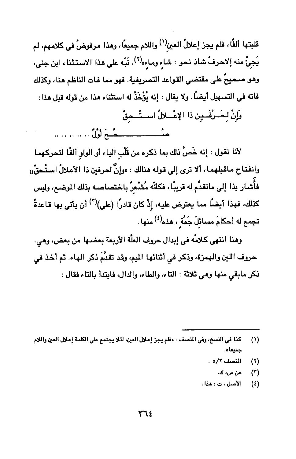 وهنا انتهى كلامه في إبدال حروف العلة الأربعة بعضها من بعض، وهي. حروف اللين والهمزة، وذكر في أثنائها الميم، وقد تقدم ذكر الهاء. ثم أخذ في ذكر ما بقي منها وهي ثلاثة: التاء والطاء، والدال، فابتدأ بالتاء فقال: